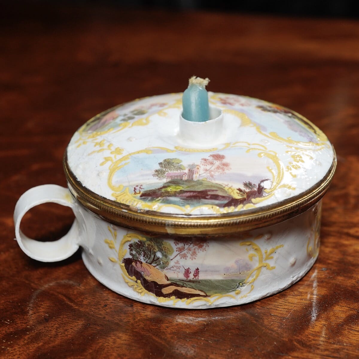 English enamel taper wax-jack box, scenic panels, South Staffordshire c.1770