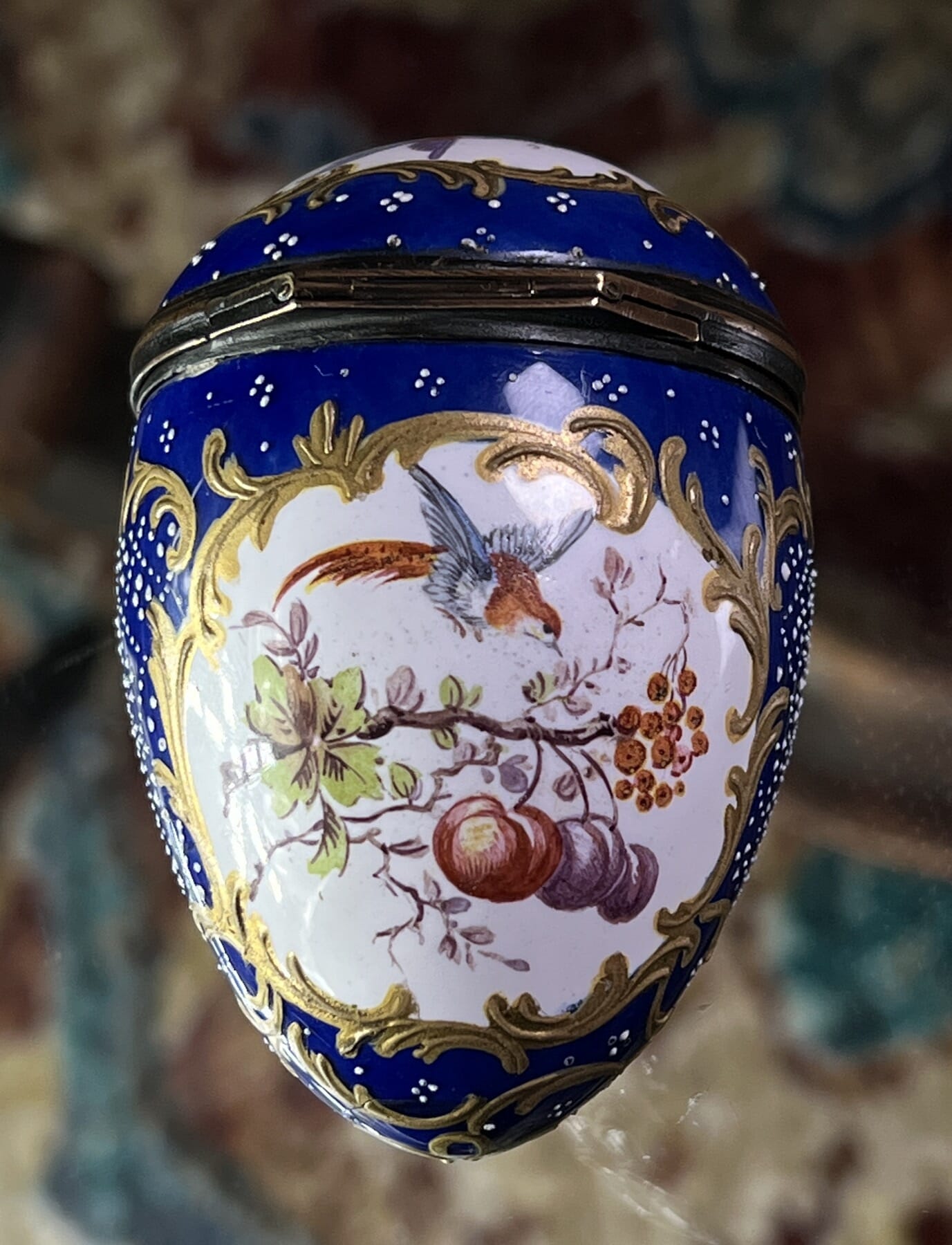 Large enamel egg box, fruit, birds & mazarine blue, French c.1870