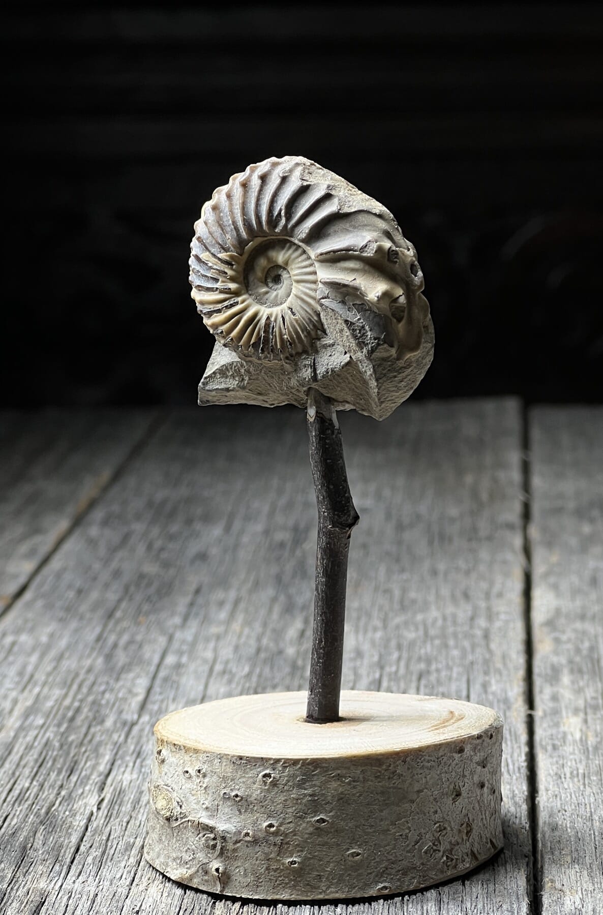 Fossil ammonite on stand, species unknown, late Jurassic UK 150 million years old