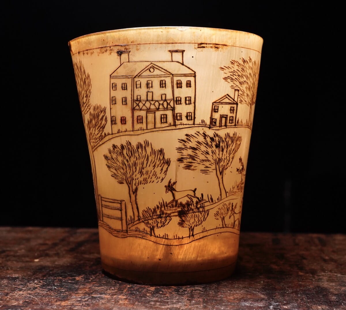 Scrimshaw cowhorn cup, Country House & Hunt scene, c. 1820