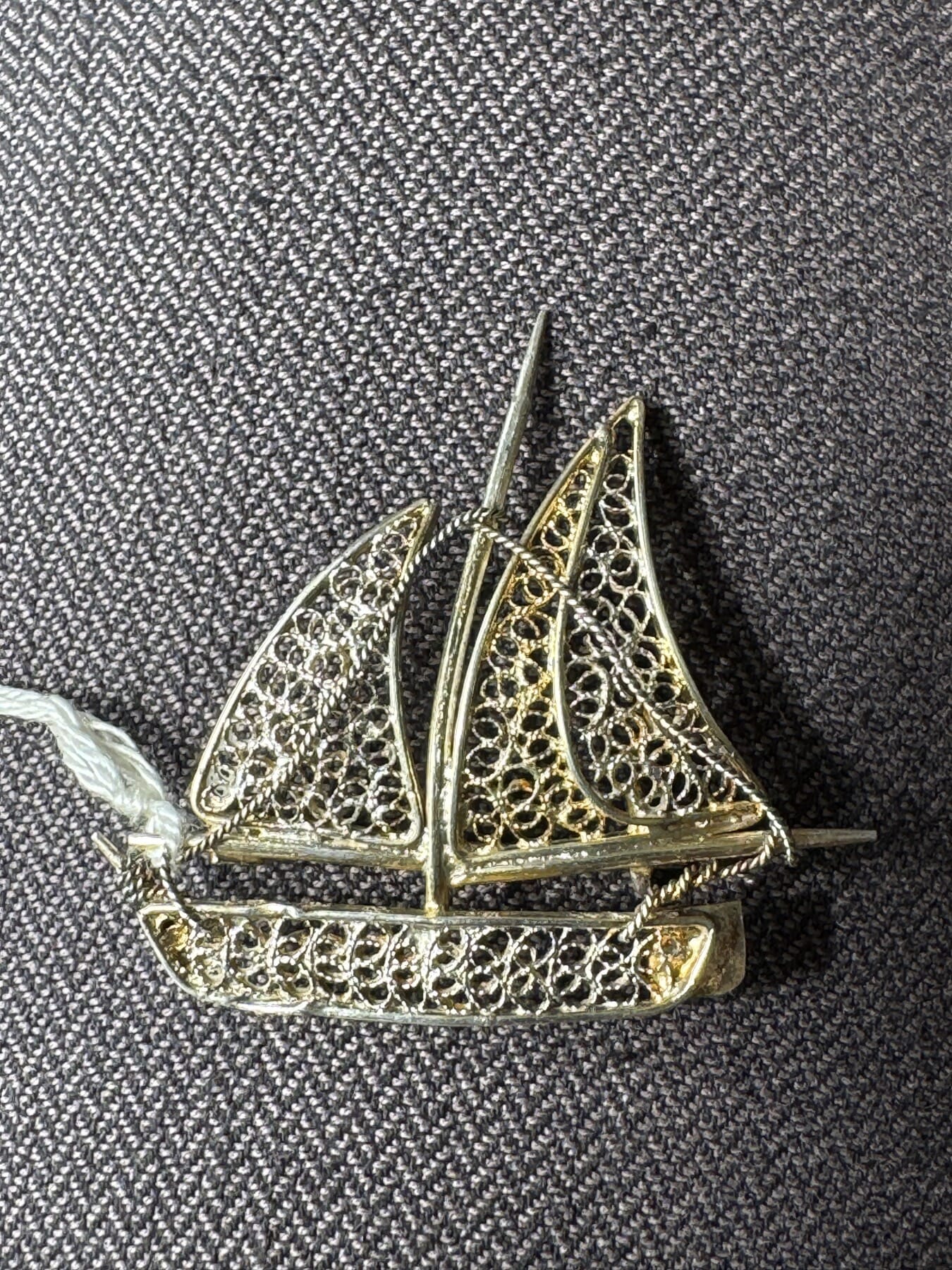 .800 Silver Filigree Brooch, sailboat, French c. 1910