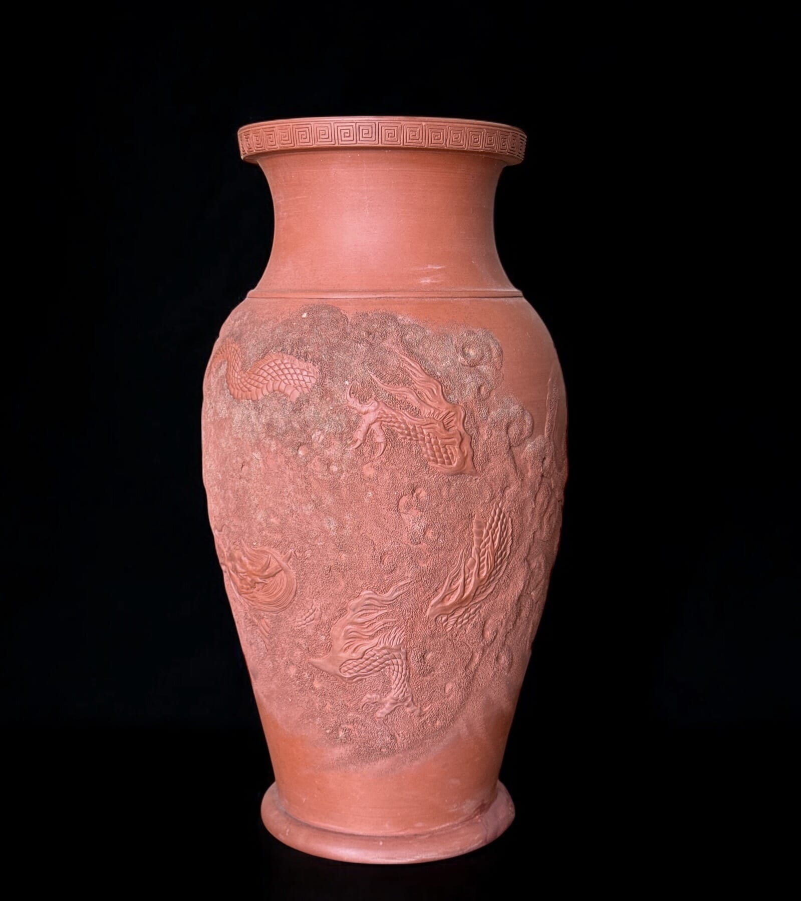 Large Japanese terracotta vase with dragons in clouds, c. 1890