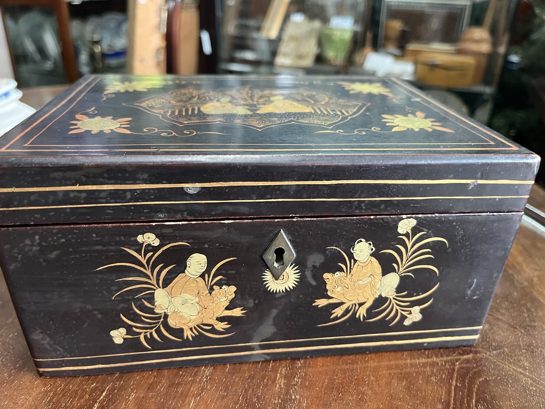 Chinese Export black lacquer box, gilt figures + flowers, mid- 19th century