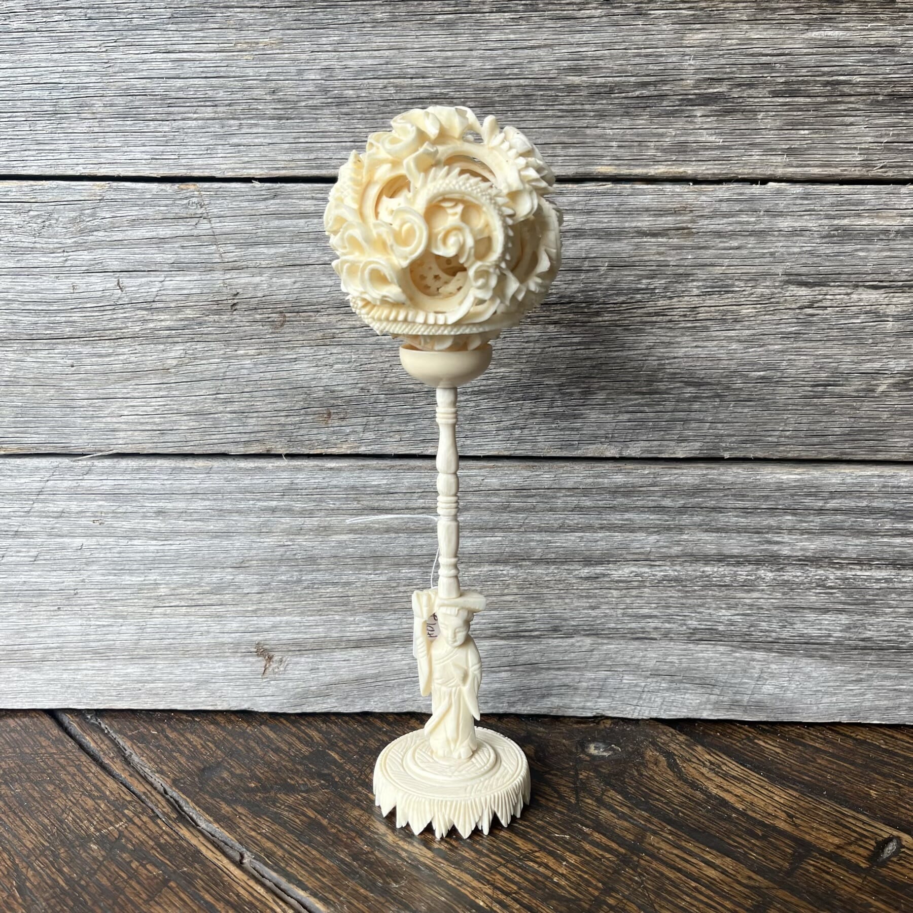 Chinese Ivory puzzle ball, figural support, damaged interior c. 1900