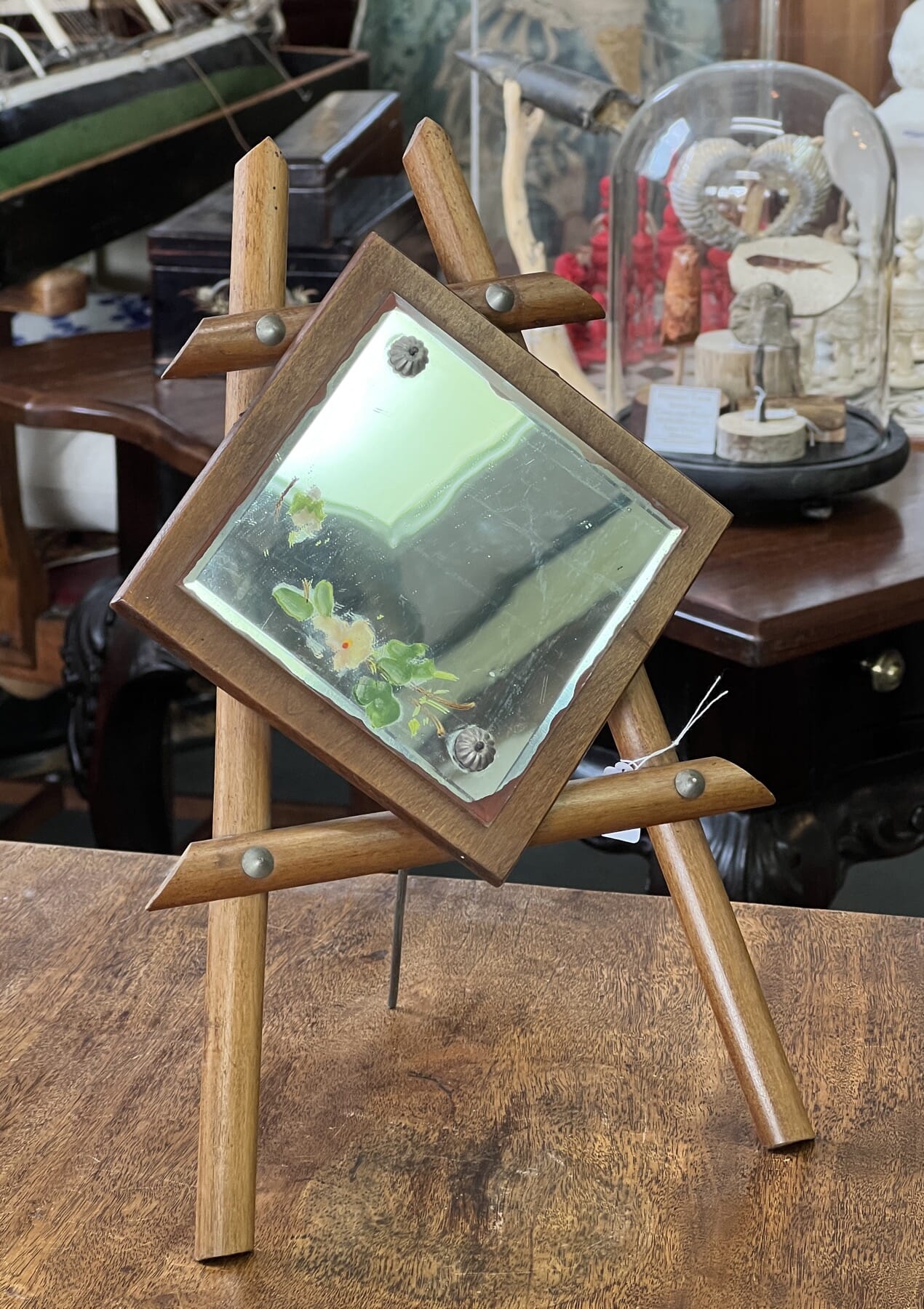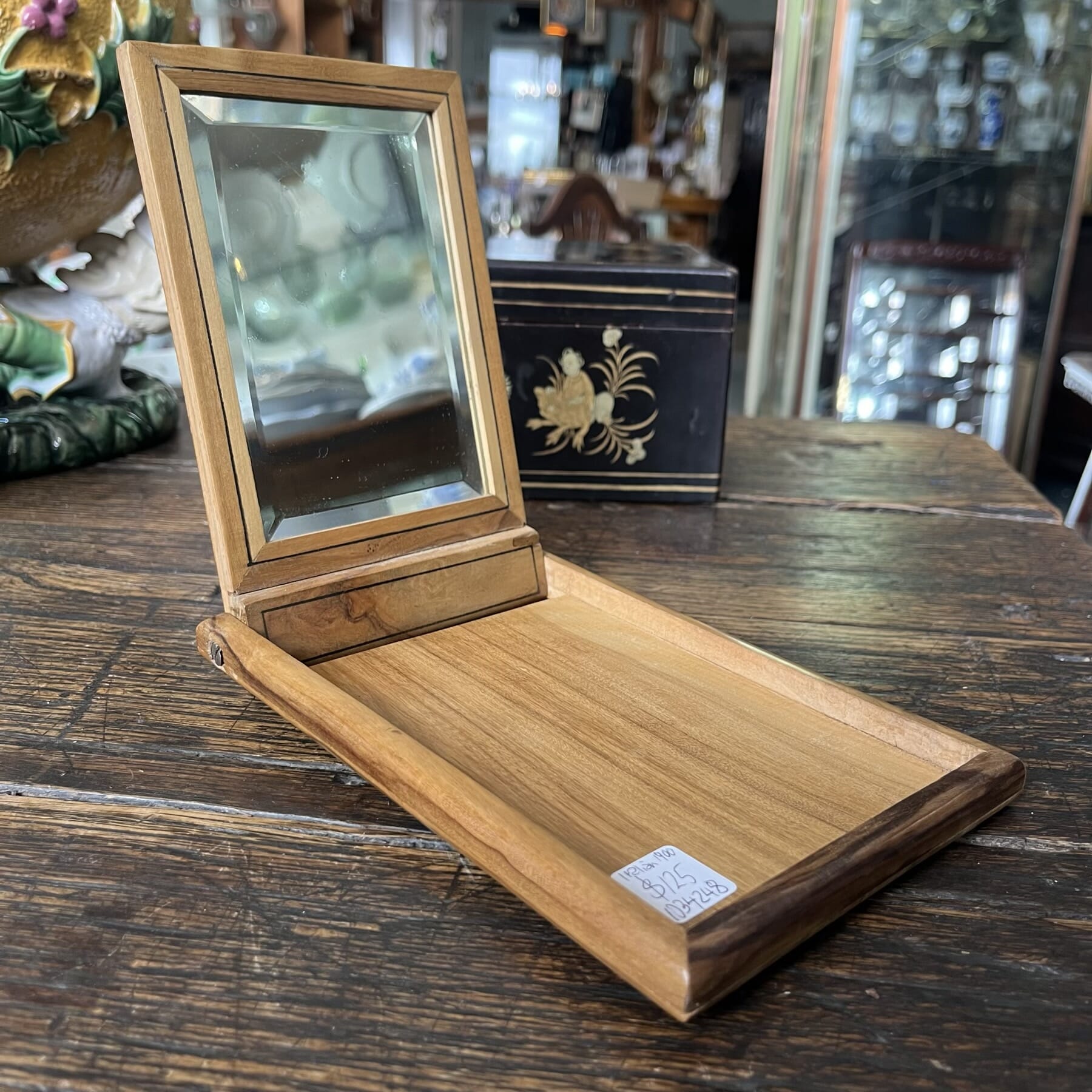 Italian Olivewood traveling mirror in case, swallow-painted, c. 1900