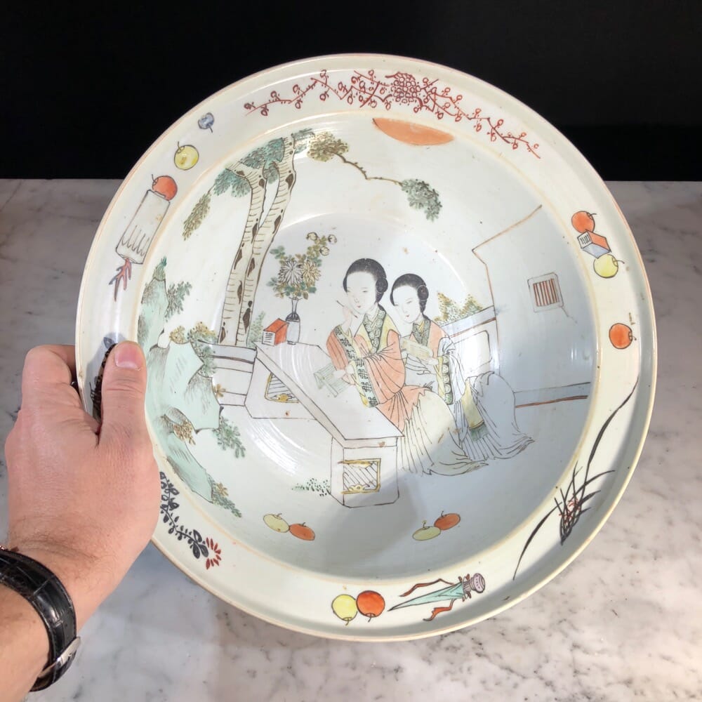 Large Chinese basin with polychrome courtyard scene, 19th century