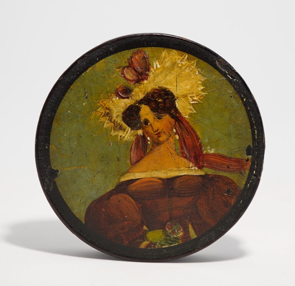 Papier mache box & cover, painted with lady’s portrait, c. 1840
