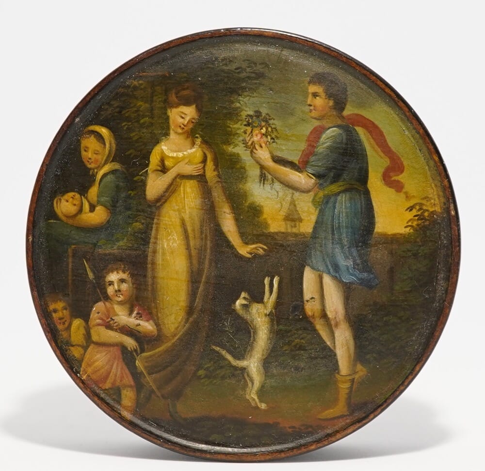 German painted papier mache snuffbox, allegorical figures, early 19th Century