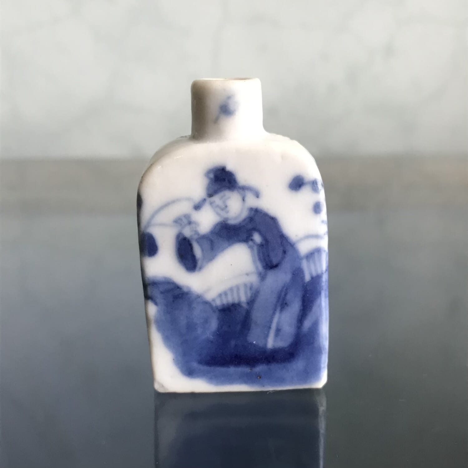 Chinese Export snuff bottle with underglaze blue figure in a garden, 19thc.