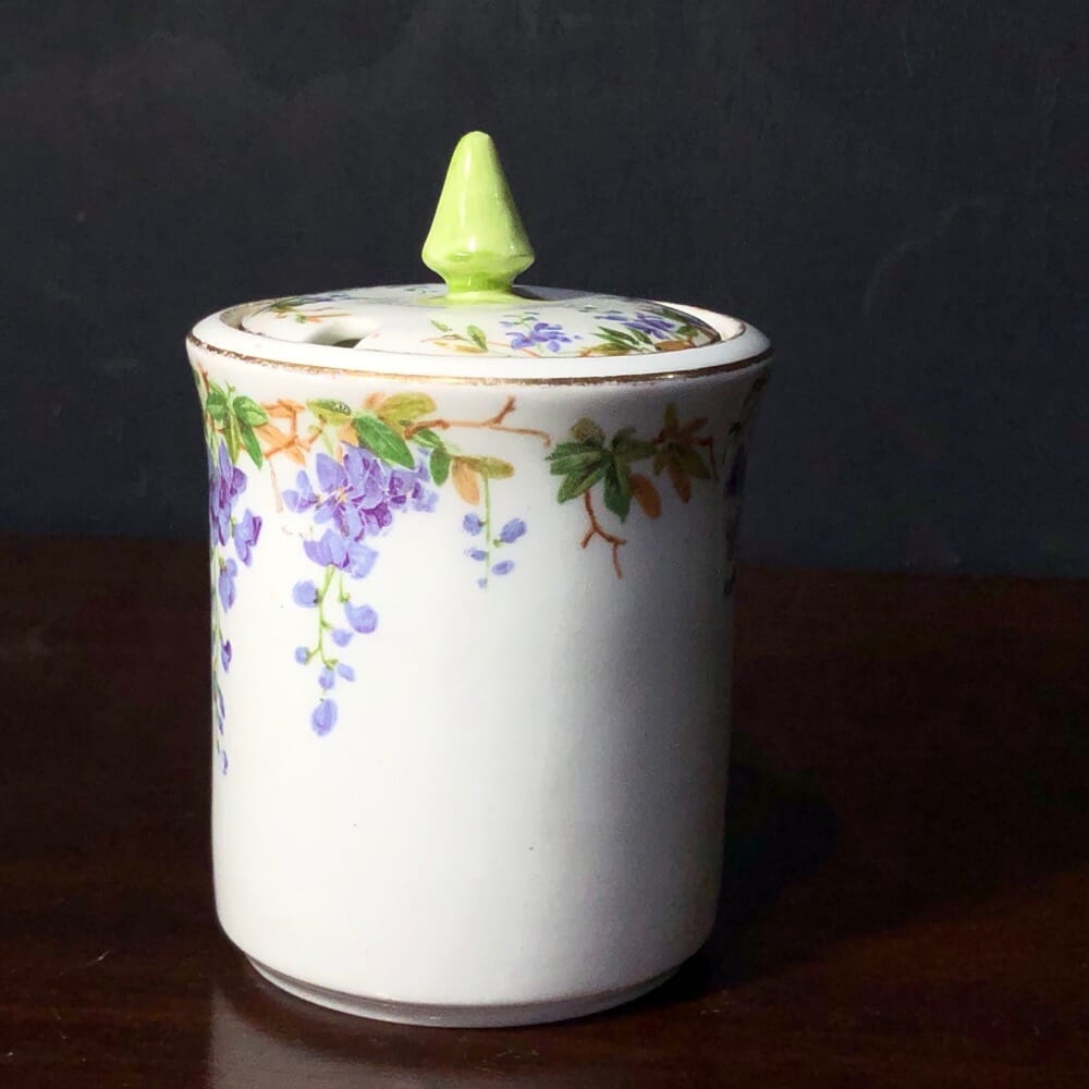Porcelain H M Williamson & Sons lidded honey pot, Wisteria pattern, c 1910