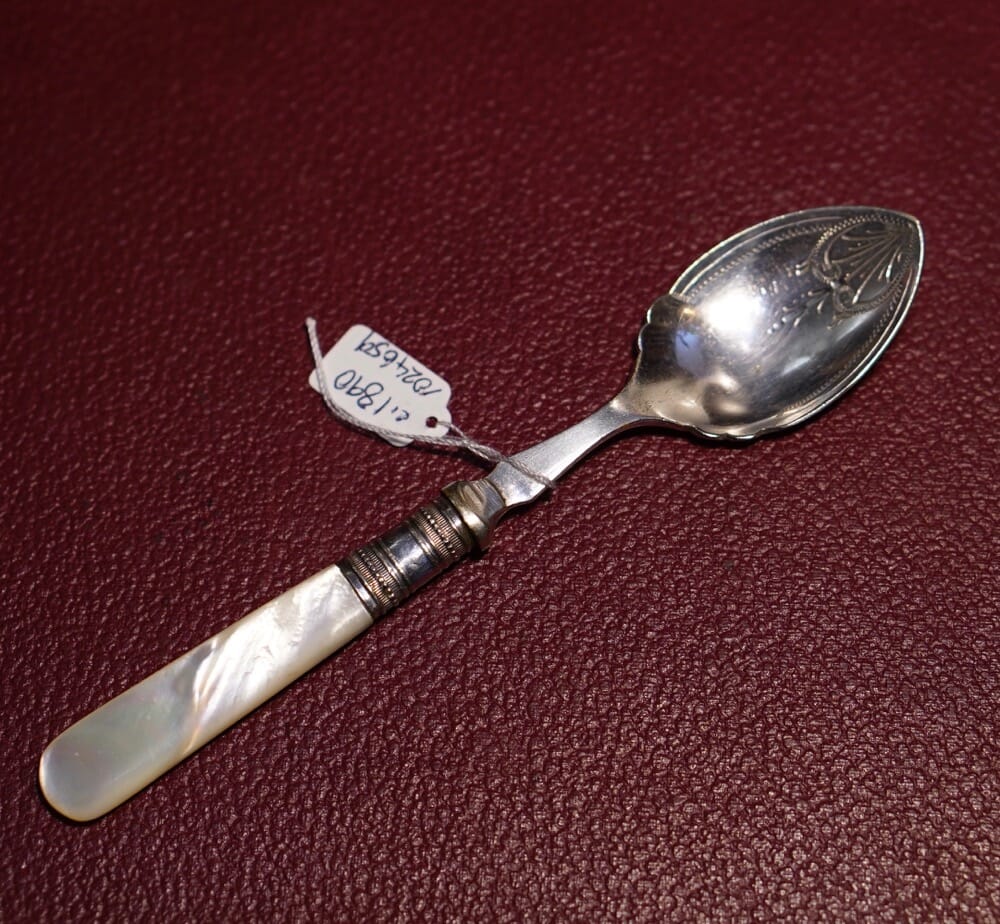 Victorian pearlshell handled jam spoon, silver mount, c. 1890