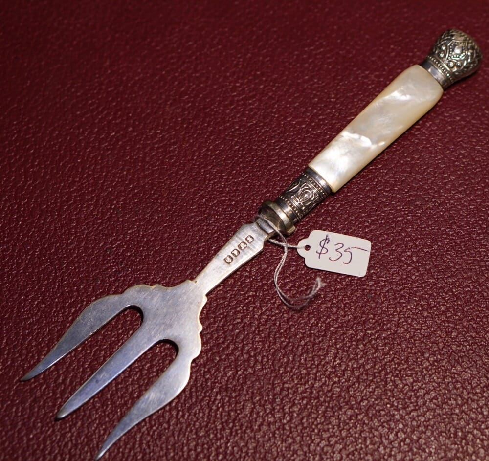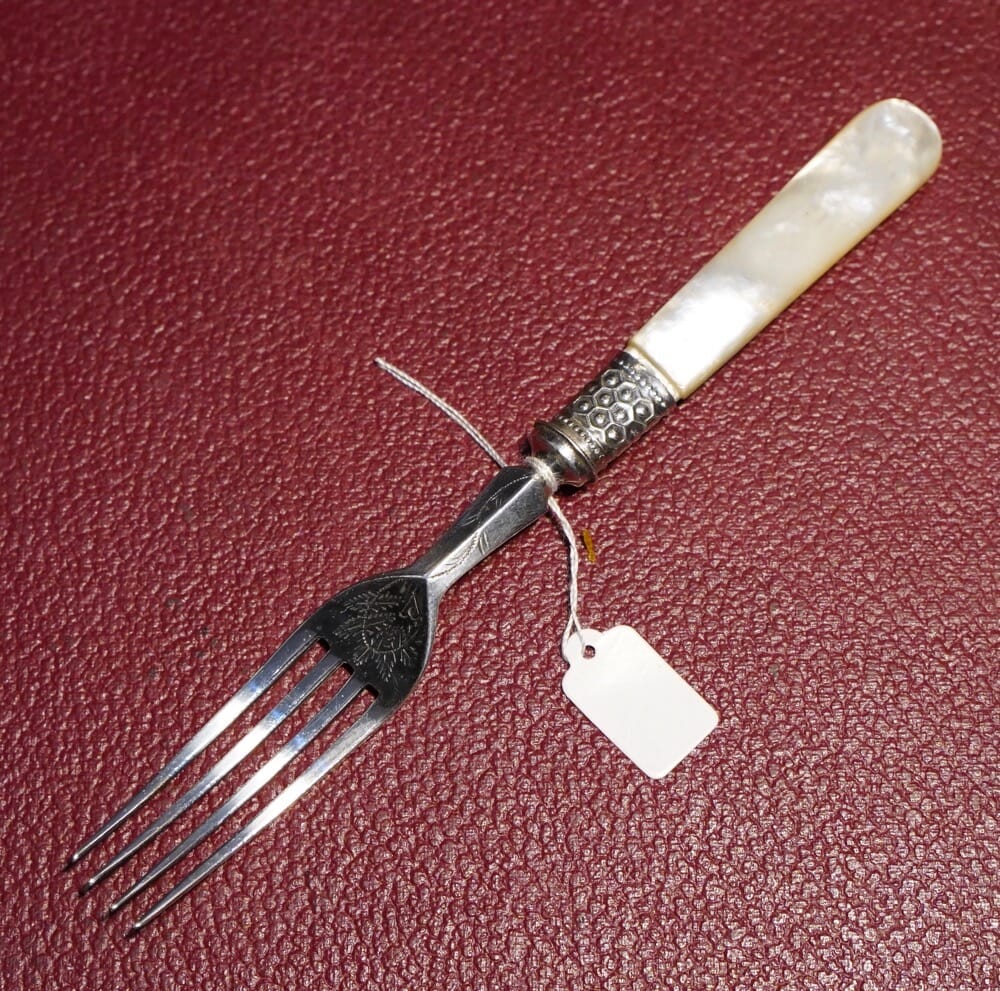Victorian pearl handled pickle fork, silver mount, c. 1890