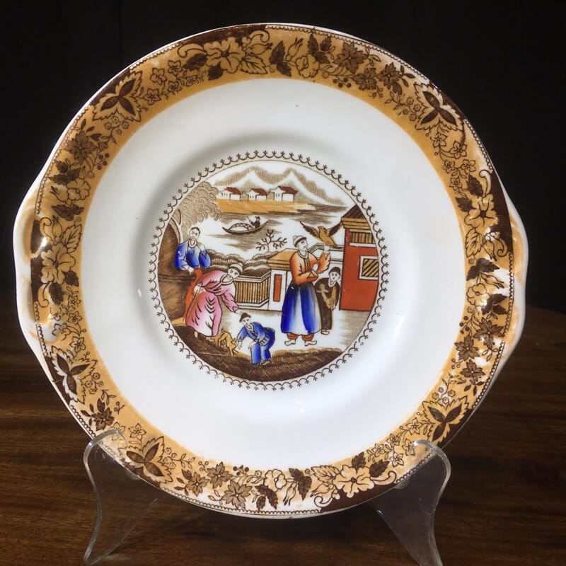 Staffordshire Pottery plate with Chinoiserie print, enamelled & lustre, c. 1870