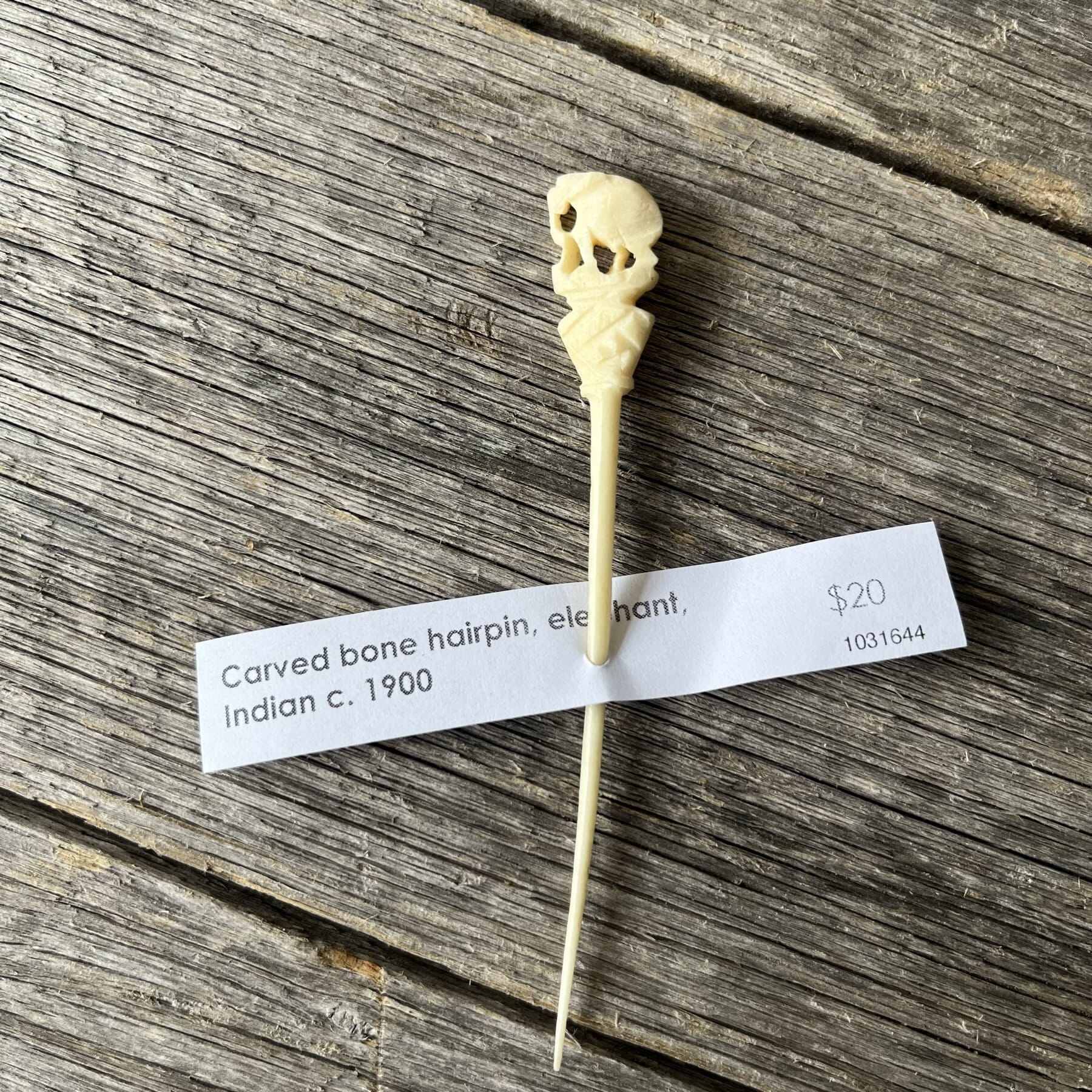 Carved bone hairpin, elephant, Indian c. 1900