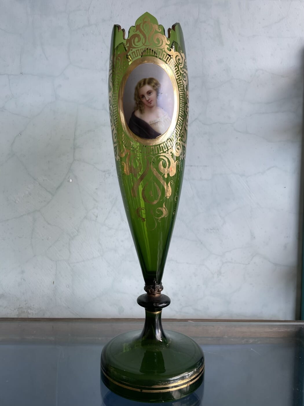 Victorian green glass tall vase, handpainted enamel portrait C. 1870