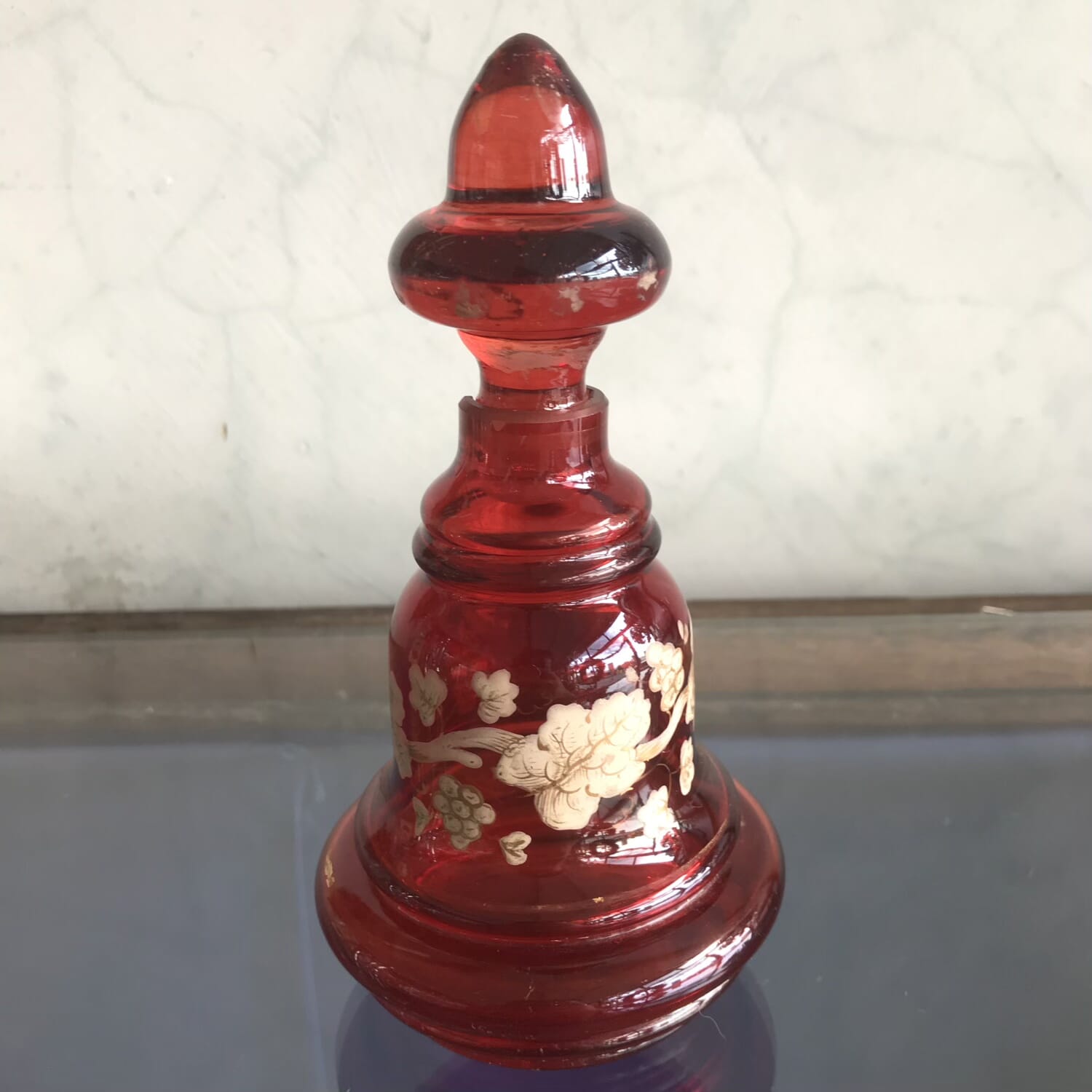 Victorian ruby glass scent bottle with fruiting vine, C. 1880