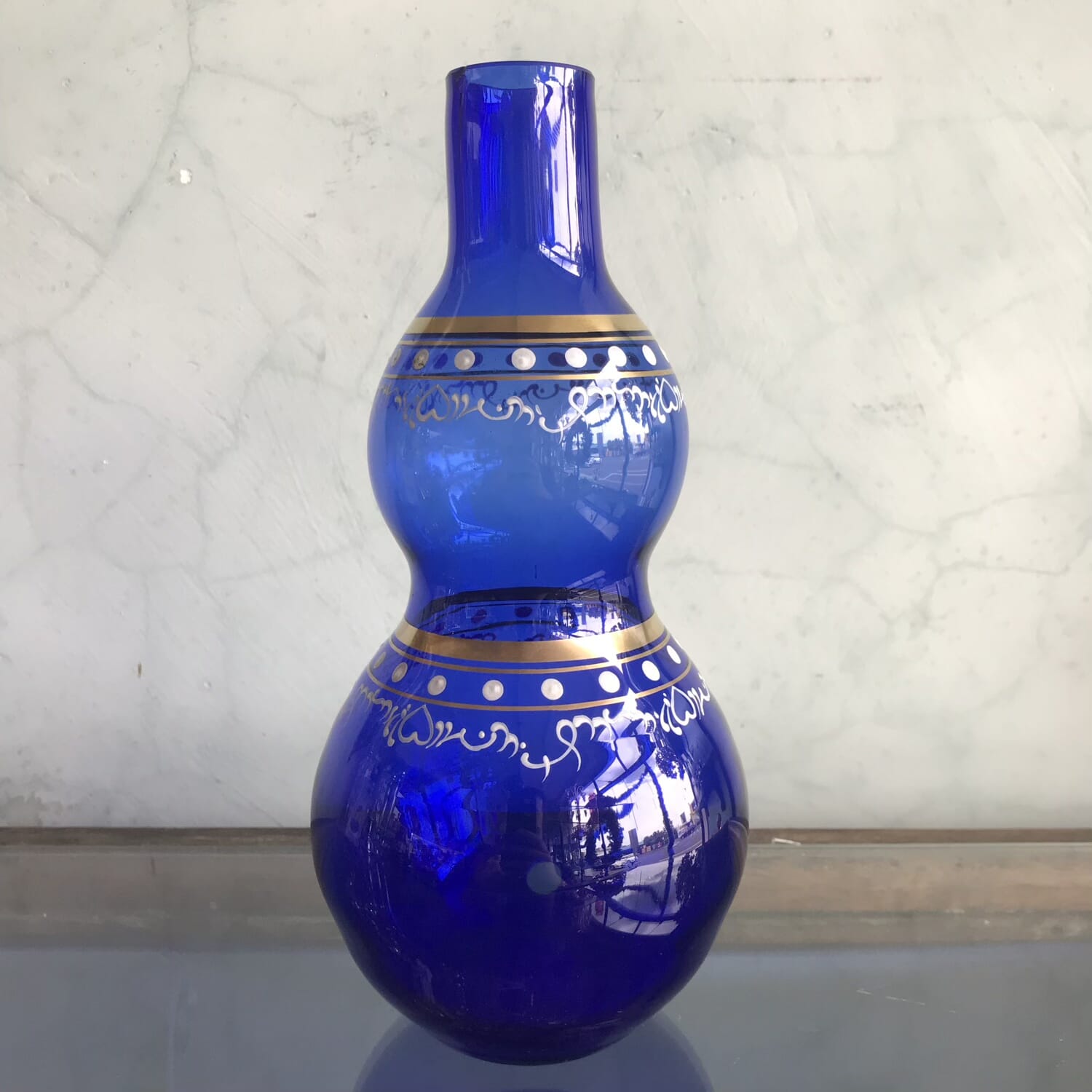 Victorian glass sapphire blue gourd shape vase with gilt bands and white enamel hearts, c.1870