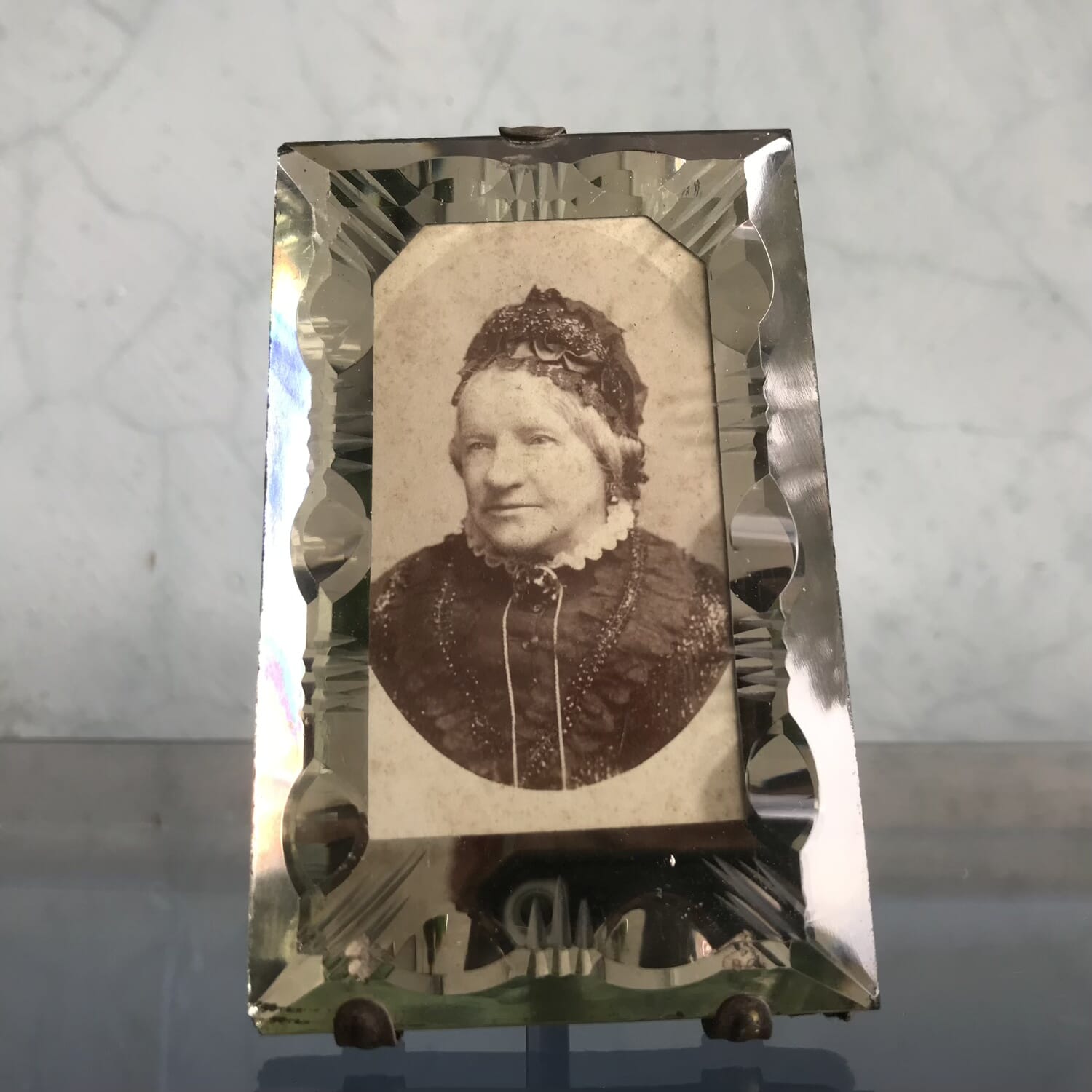 Small Victorian photograph of a dowager in a faceted glass frame, c.1870