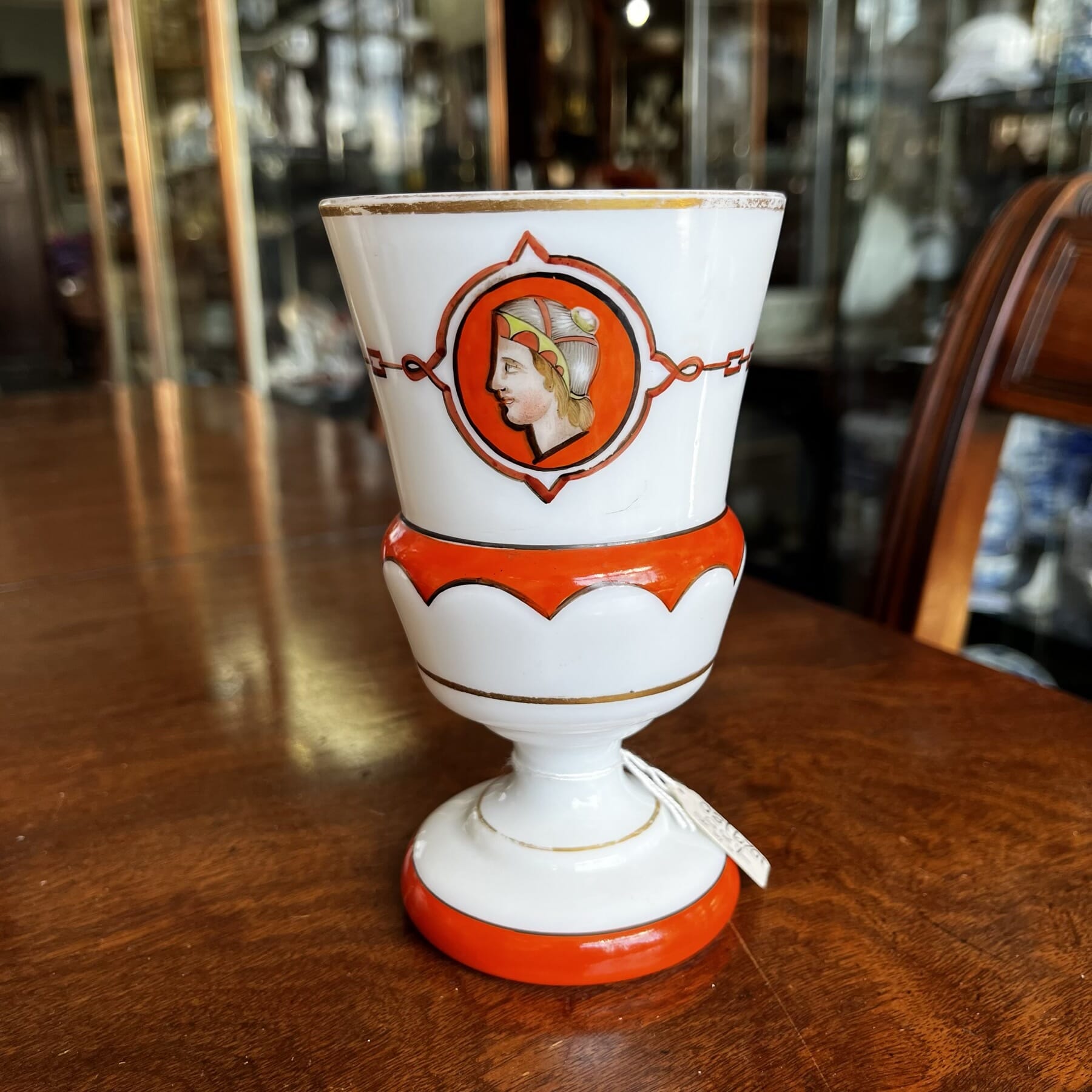 Victorian milk glass vase with greek portrait and classical orange decoration, c.1870