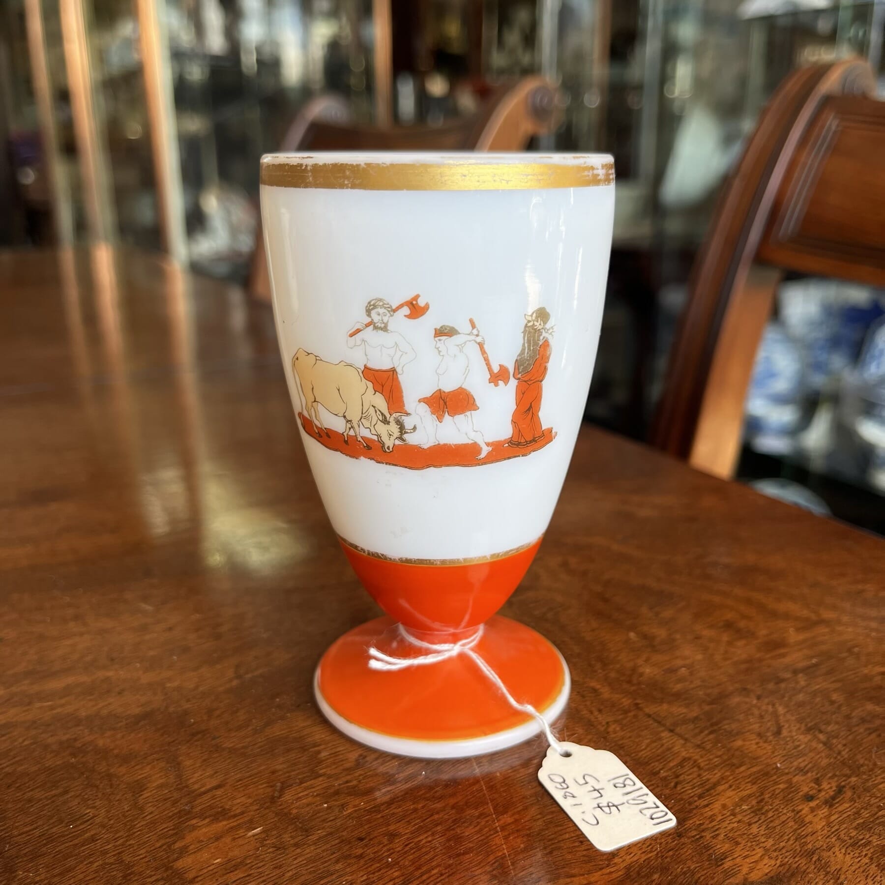 Victorian milk glass glass with printed orange classical scenes, c.1860