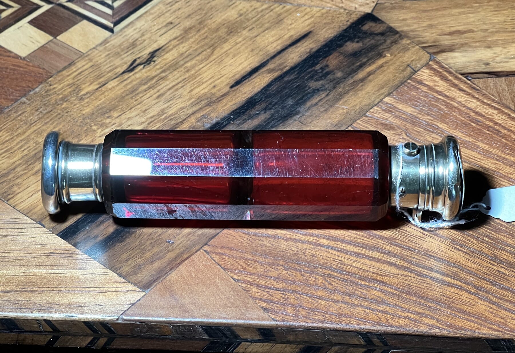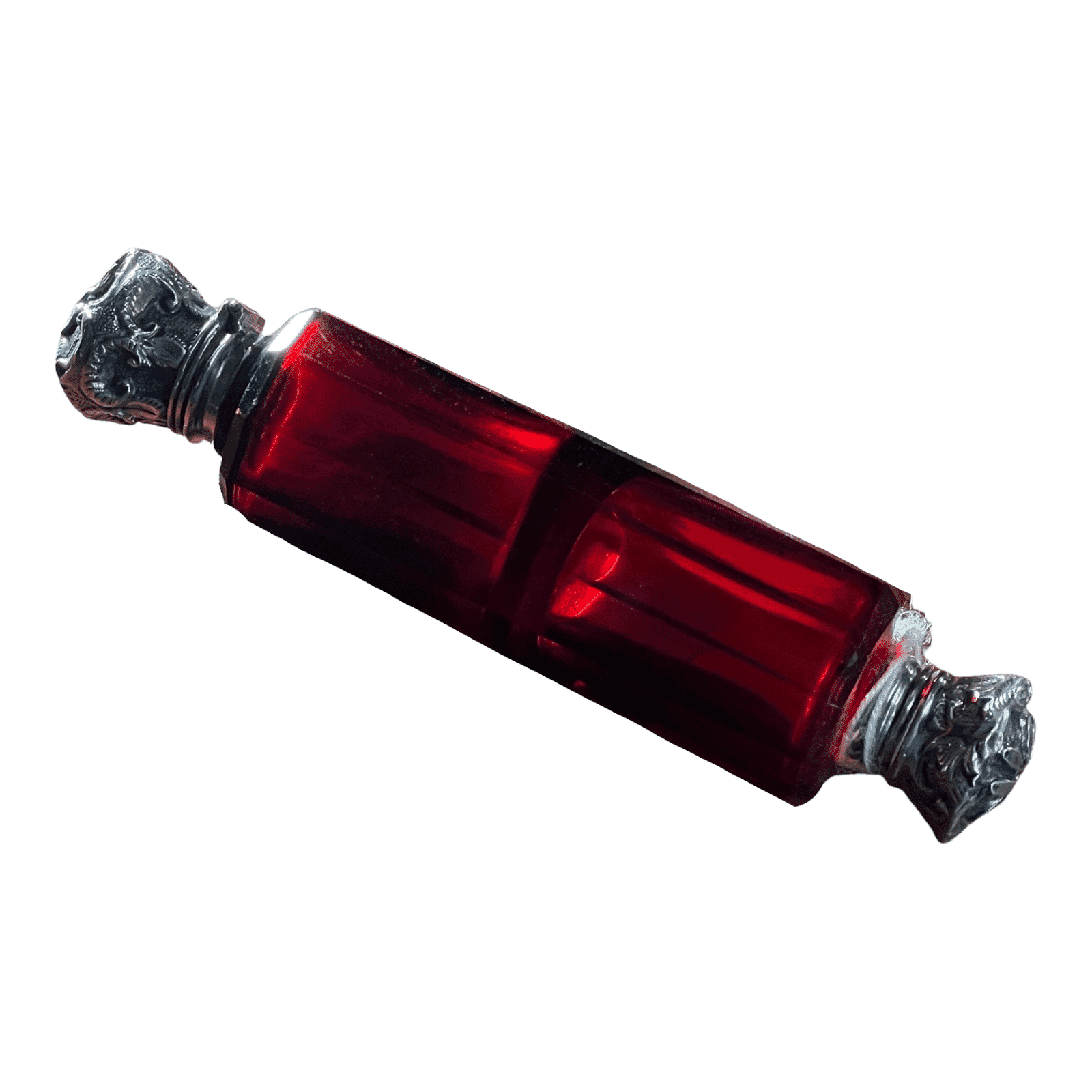 Victorian double ended scarlet glass perfume bottle, sterling mounts,