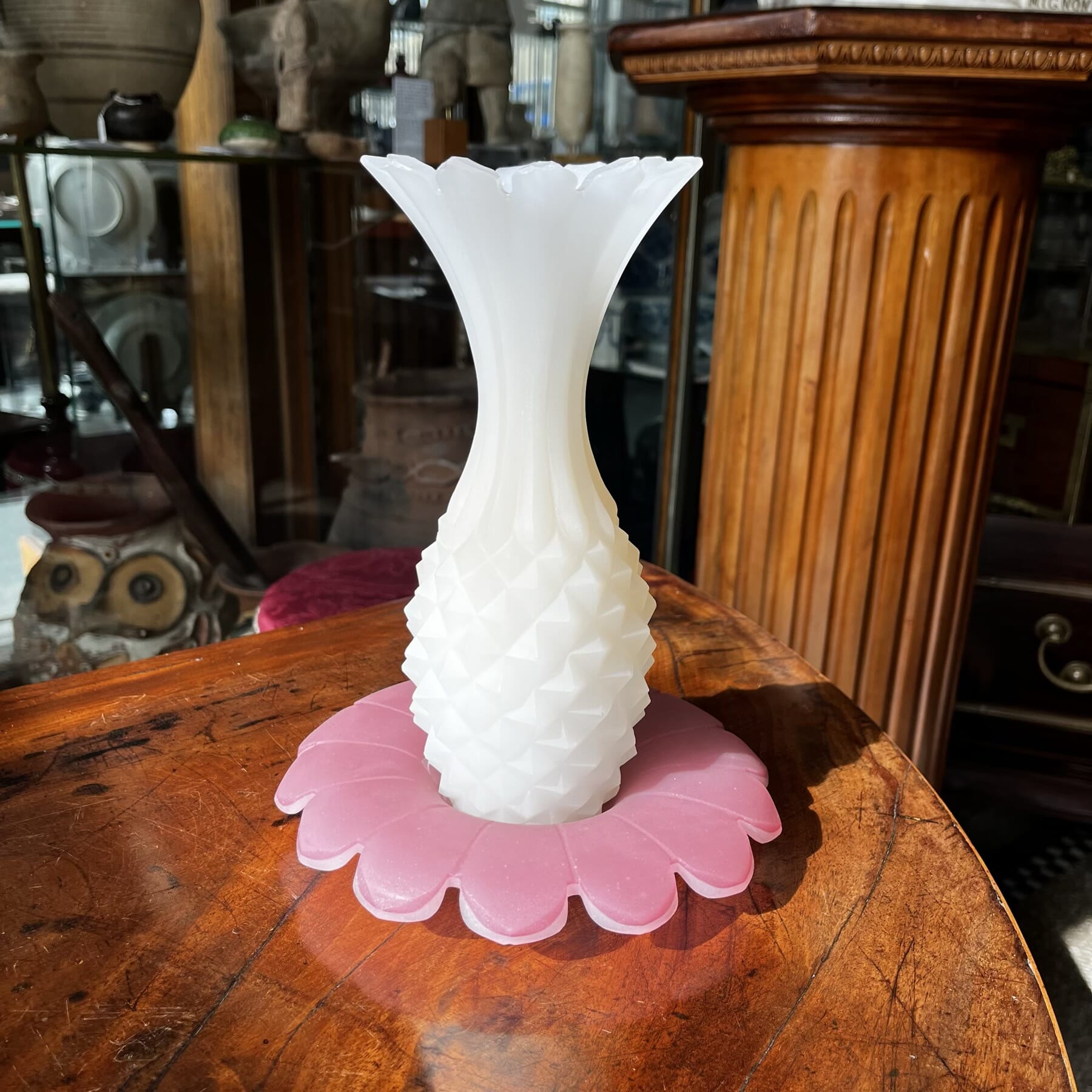 Unusual glass pineapple & stand, frosted, c. 1850