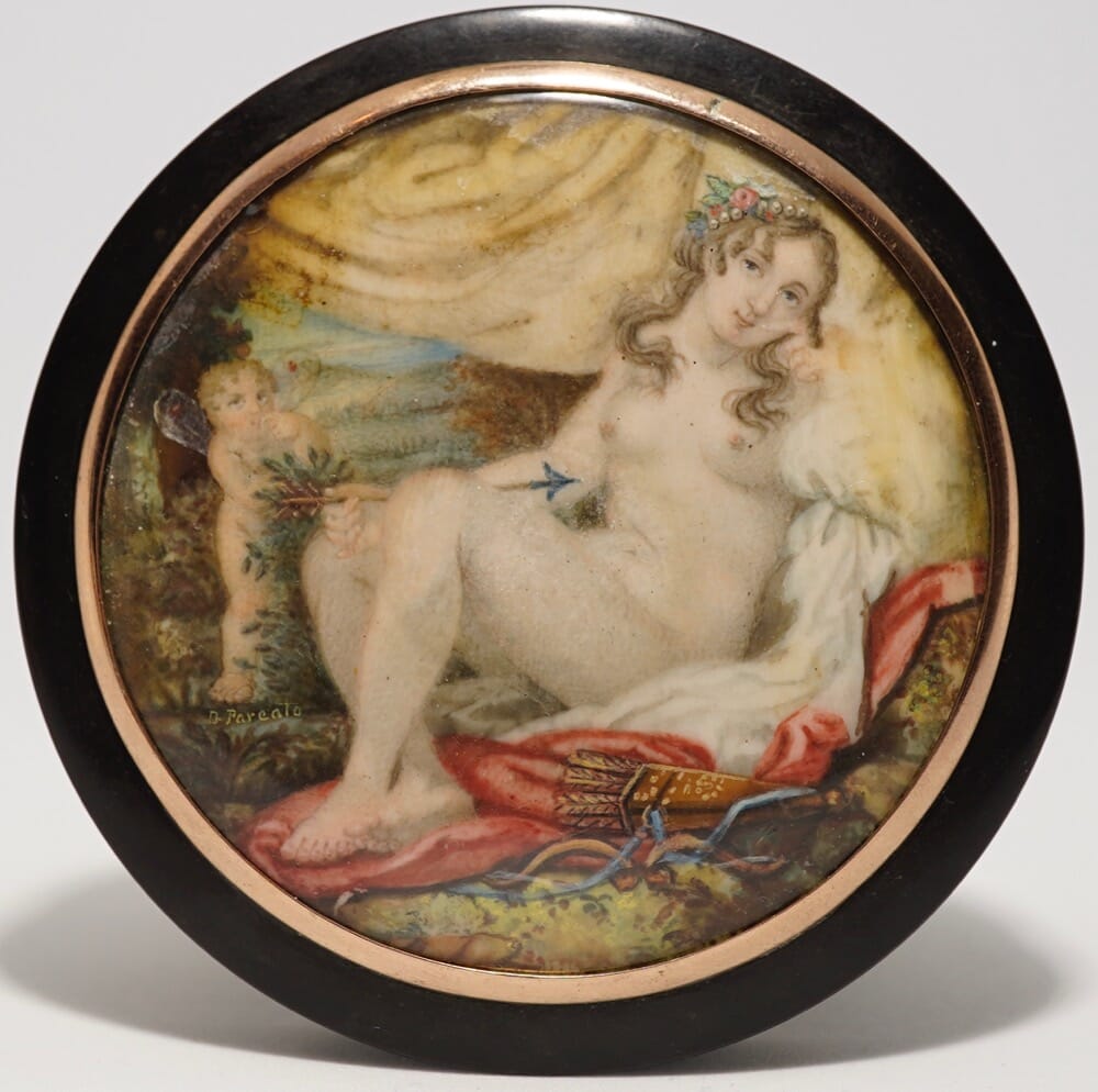 Snuff box with hand painted ‘Venus & Cupid’ , signed D Pareato – c. 1880