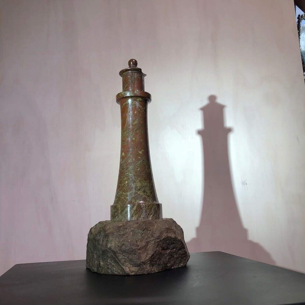 This red stone is unique to Cornwall, and in particular the foot of the ‘Lizard’, the most south-westernly point of England. While specimens had been collected for centuries, it was after a visit by Queen Victorian & Albert in 1846 that popularity grew. They ordered a fireplace and vase plinths for Osbourne House, and by the 1851 exhibition a large amount of ornamental stone pieces were on display. The Lighthouses were a favourite, souvenirs of the wonderful Cornish coastline.