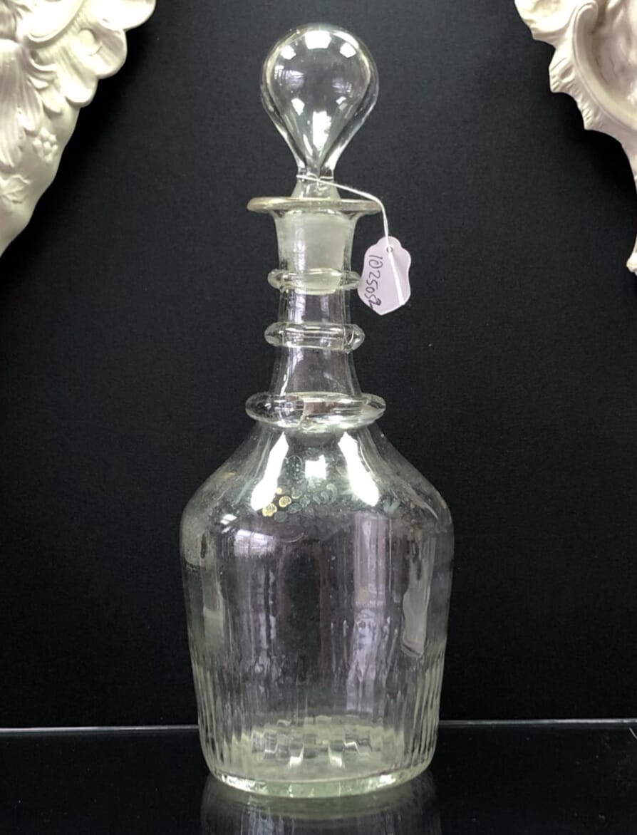 Early Victorian decanter, the ring-neck form with engraved fruiting vine, mushroom form stopper.