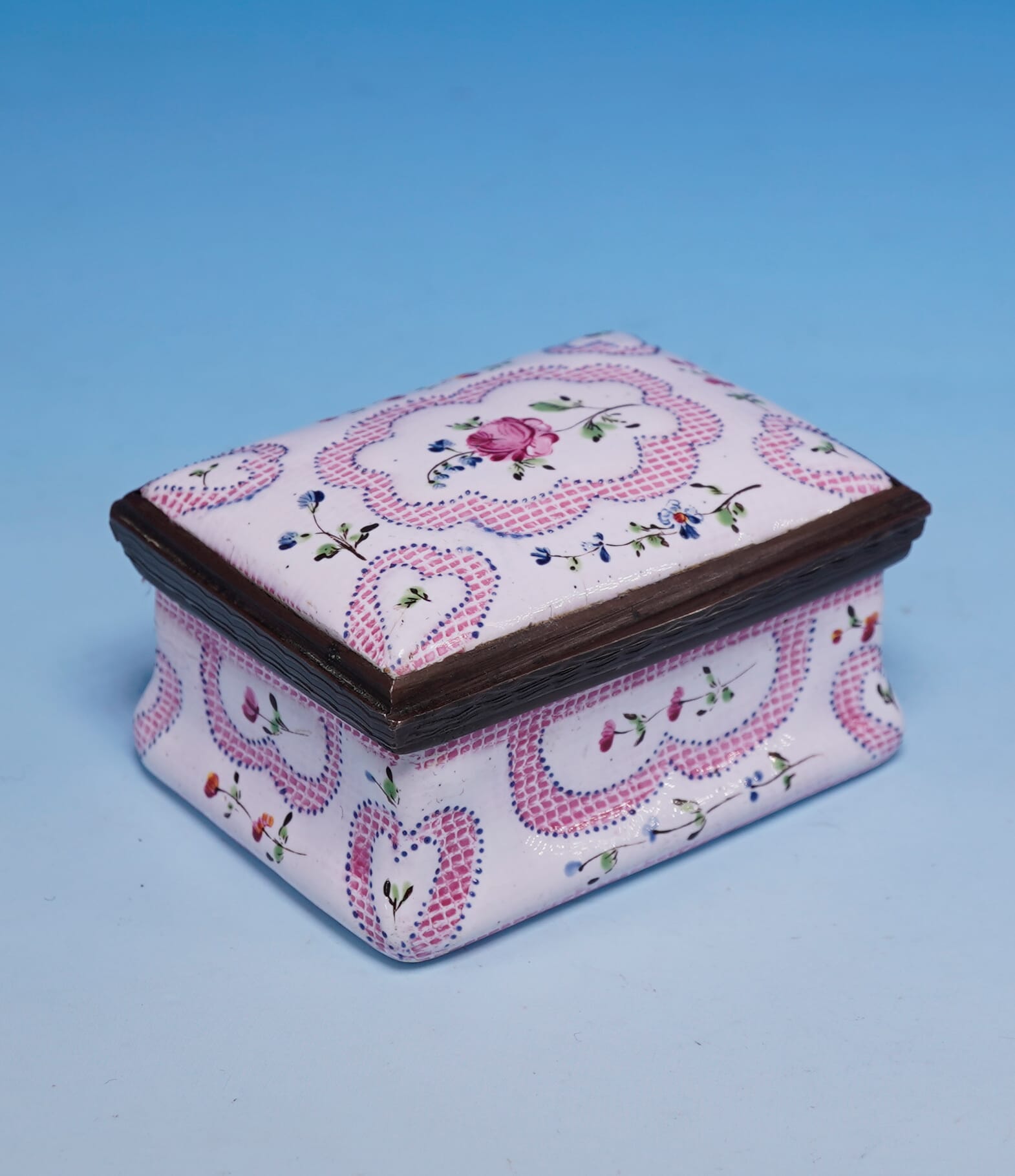 English enamel box, hand painted with central flower group, reserved in a white oval with raised white enamel scroll border, the ground with scattered white leaves & buds, the sides similar with scattered flower specimens.