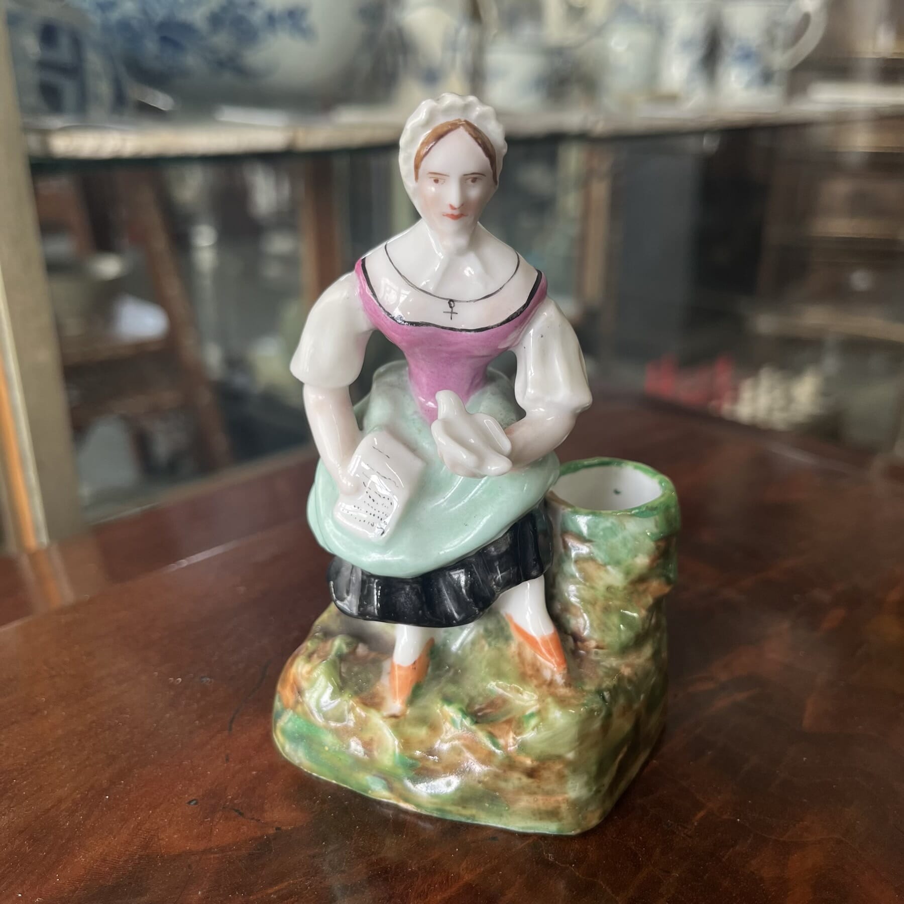 Rare Minton Majolica ‘Chinaman’ teapot, modelled as a seated figure with comb in hair, the head functioning as the lid, a broad hair plait to one side as the handle, holding an actor’s mask with spout protruding from it’s mouth, the whole brightly coloured in majolica glazes.