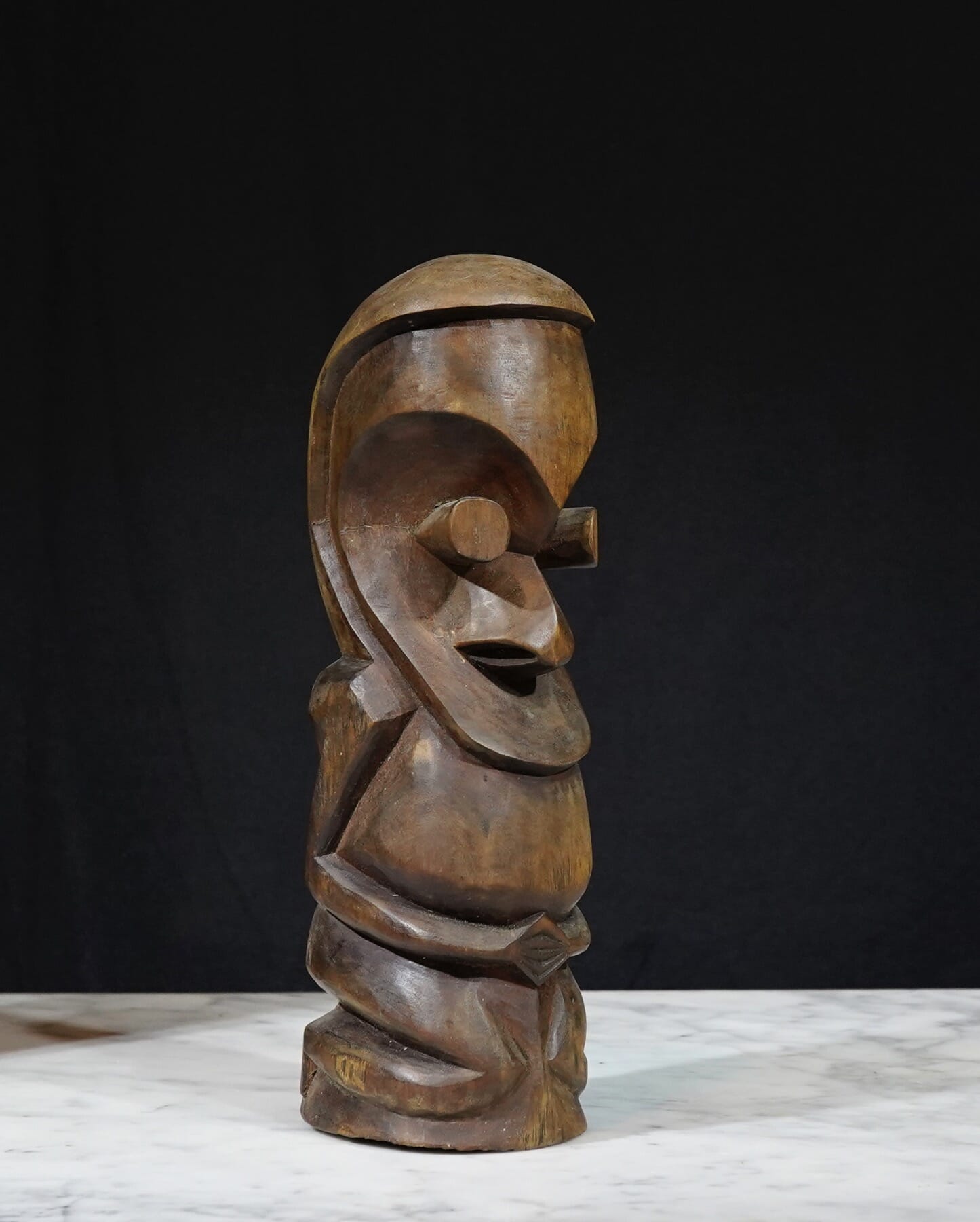 New Caledonian carved wooden figure of a man, with stylised face & round protruding disk eyes, shown with swollen belly in a slightly squatting position.