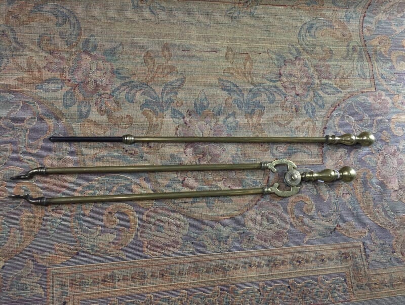 Set of three brass fire iron tools, lattice handles, c. 1875