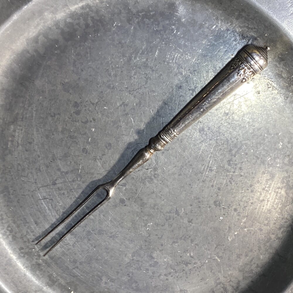 Silver handled 2-prong fork, the cannon-form handle with bulbous end and knob on cap.