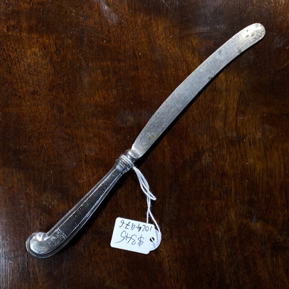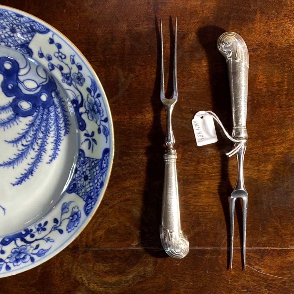 English Silver handled fork, the pistol grip handle engraved with a crest of a dog’s head, hallmark ‘TM’ for either Thomas Mann or Thomas Mason,