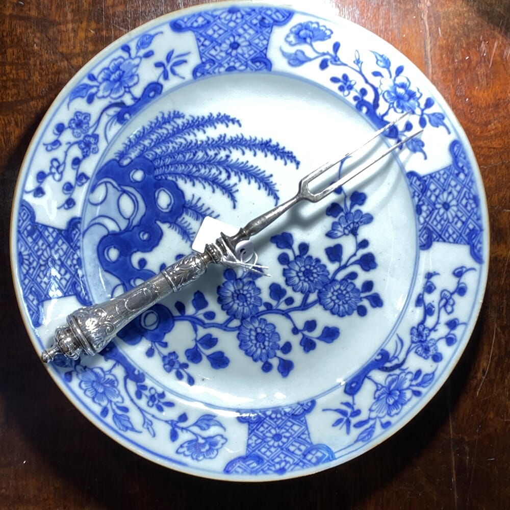Silver handled 3-prong fork, the cannon-form handle with embossed bands and spiral fluting, a ‘target’ on cap.