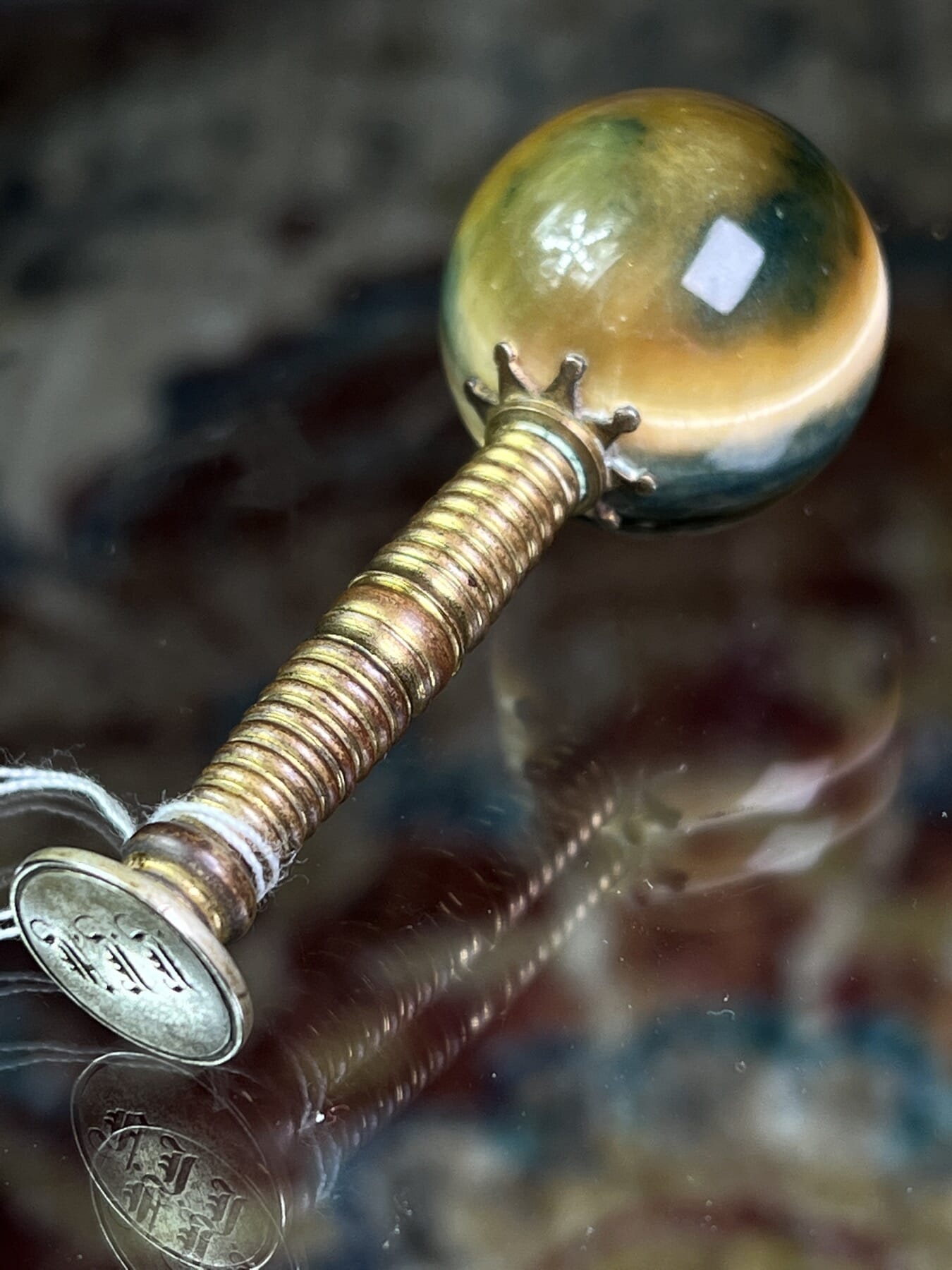 Small gilt-metal circular portrait brooch with rope twist border, set with an early photo of a man with a magnificent moustache.