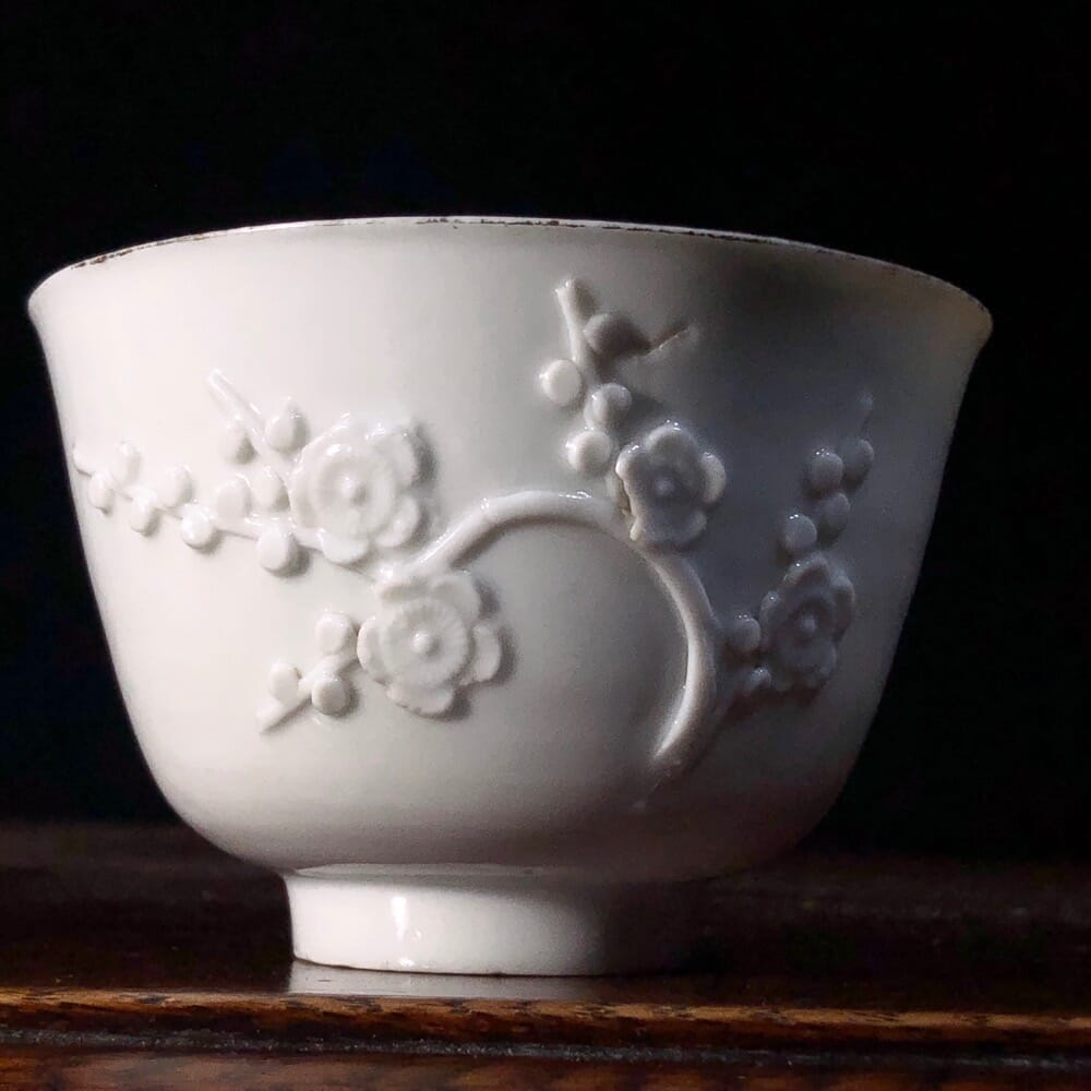 Small bowl with prunus flower sprigging in the ‘blanc-de-chine’ manner, left in the white.