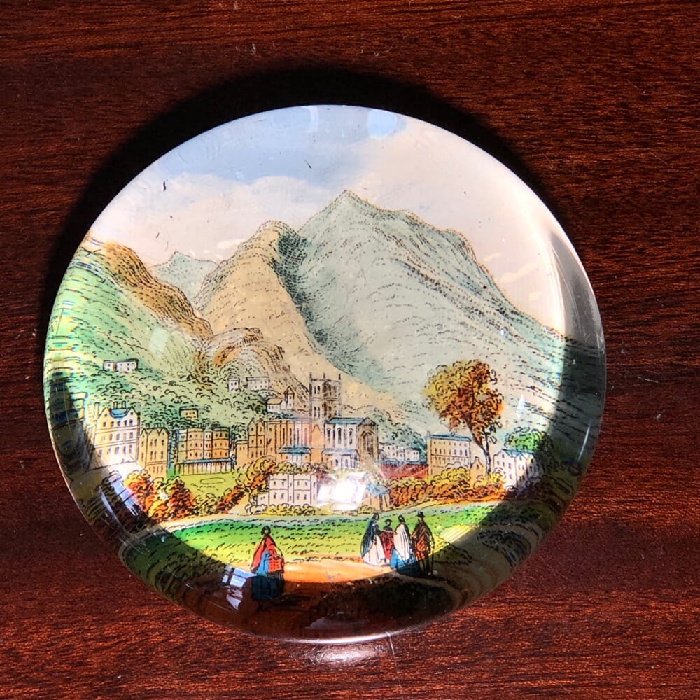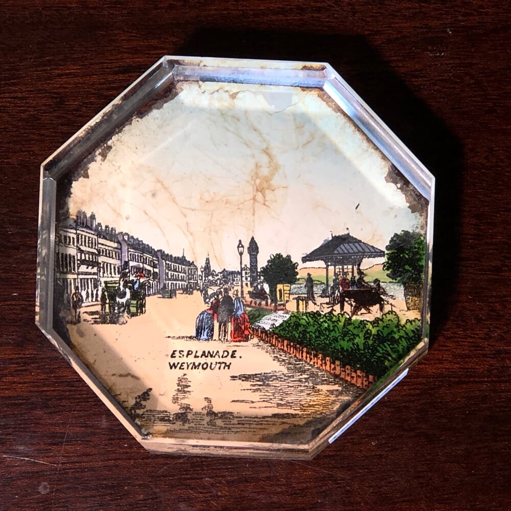 Victorian glass paperweight souvenir, printed in colour with a seaside view, titled “COWES – ISLE OF WIGHT”.