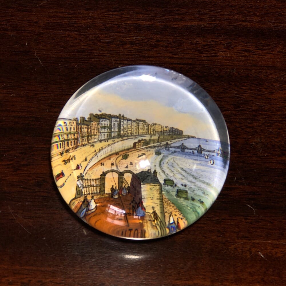 Victorian glass paperweight souvenir, printed in colour with a pier sceen, titled “PIER HASTINGS”.