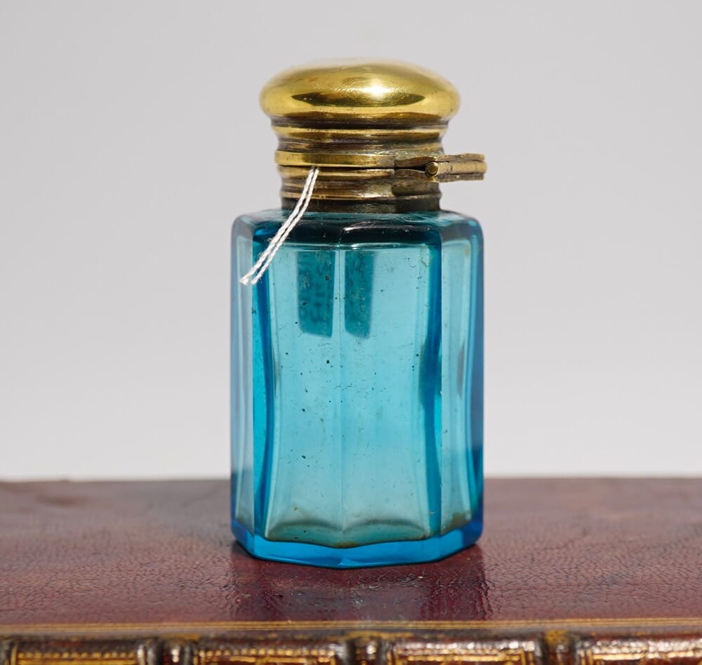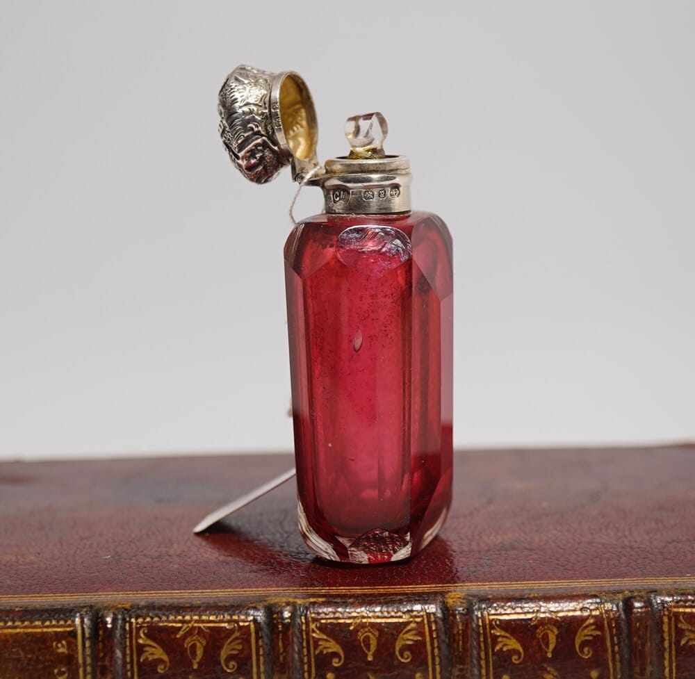 Victorian green cut glass perfume bottle of egg shape, mounted with gilt metal top, the chain with finger ring.