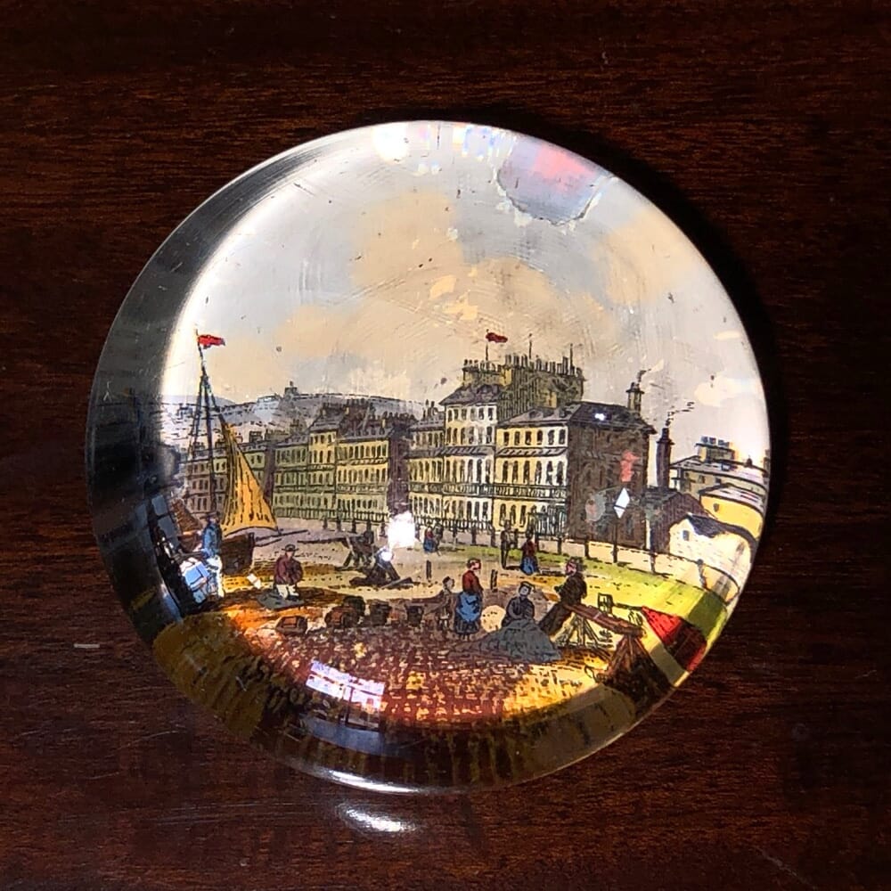 Victorian hexagonal glass paperweight, printed in colour with a view of the spa town Ilkley, titled “ILKLEY” .