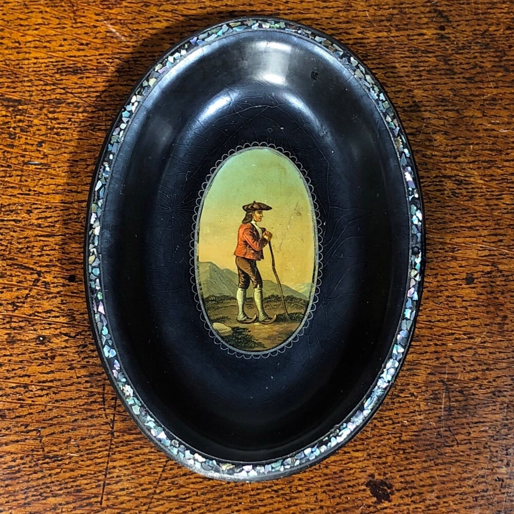 Victorian papier mache coaster with pewter inlay, c. 1860