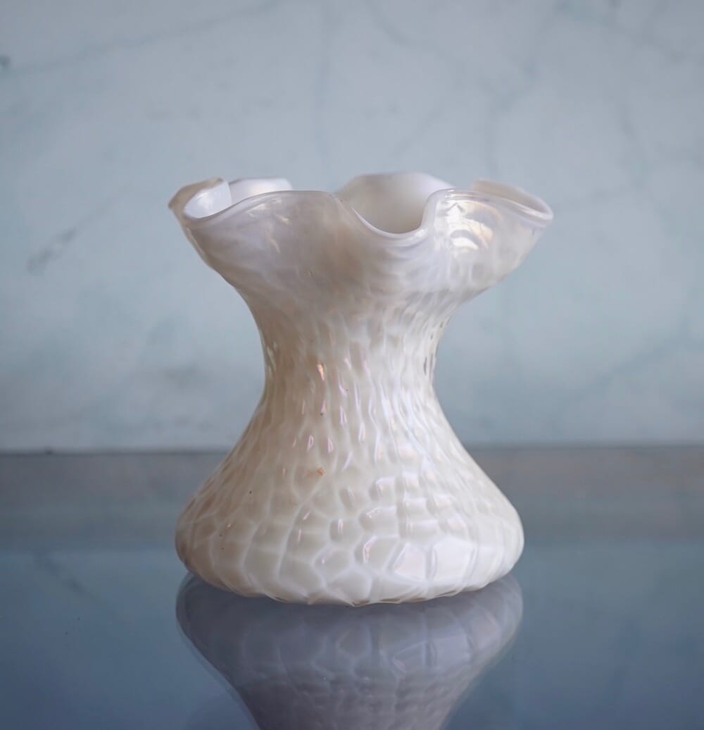 Victorian Uranium glass fluted beaker, spiral fluted with opposite spiral of opaque white stripes.