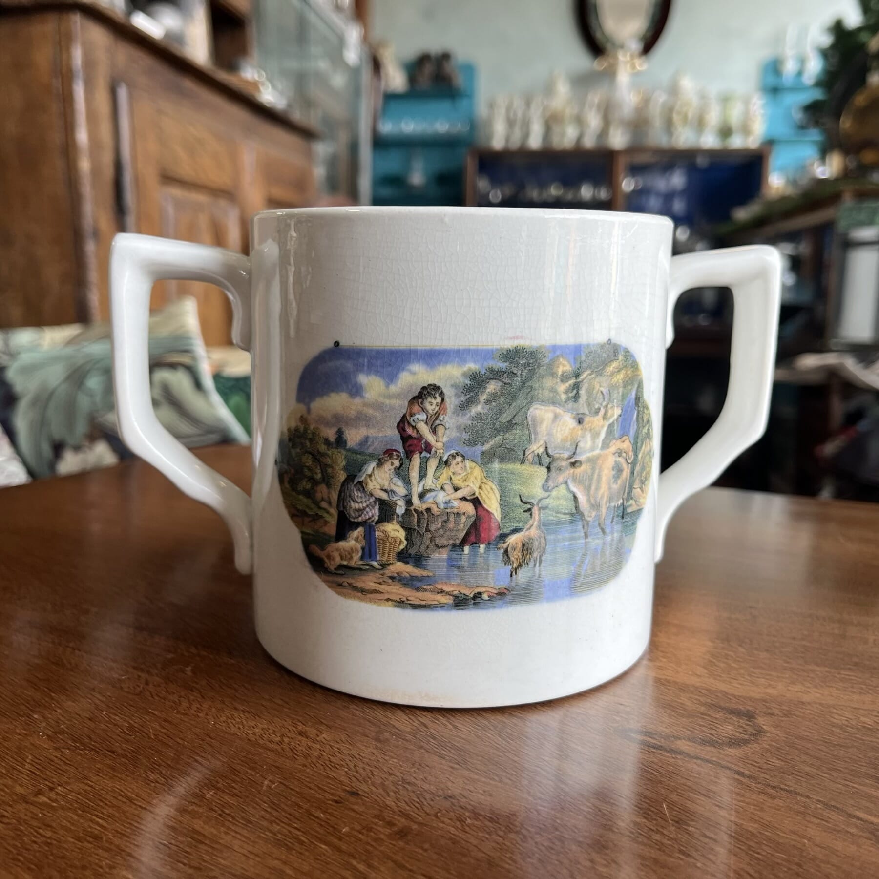 Pratt printed double-handled mug, seaside & river scenes, c. 1860