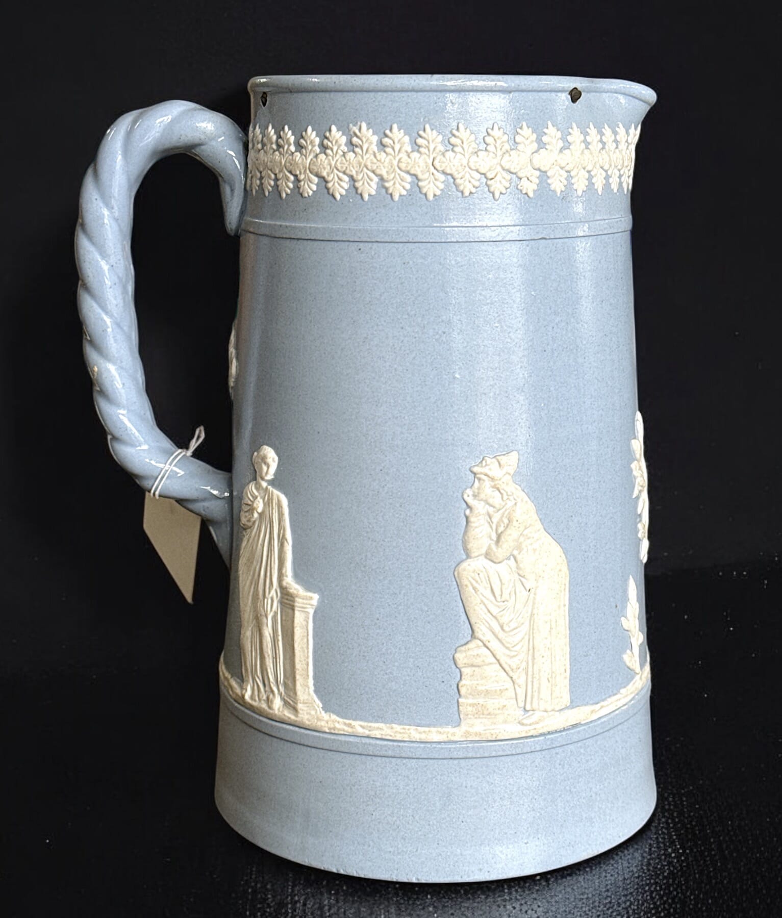 Large pale blue jug ‘Jasper’ smearglaze jug with white classical figure sprigs, prob. Dudson, c. 1870