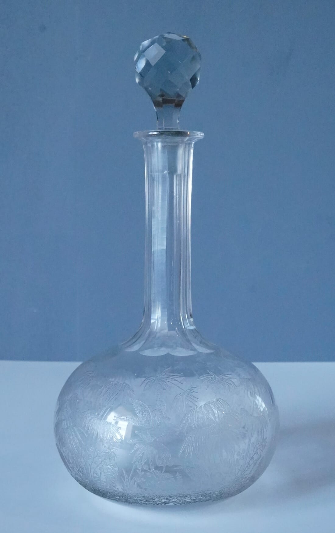 Victorian decanter etched with tropical palms & cranes, c. 1870