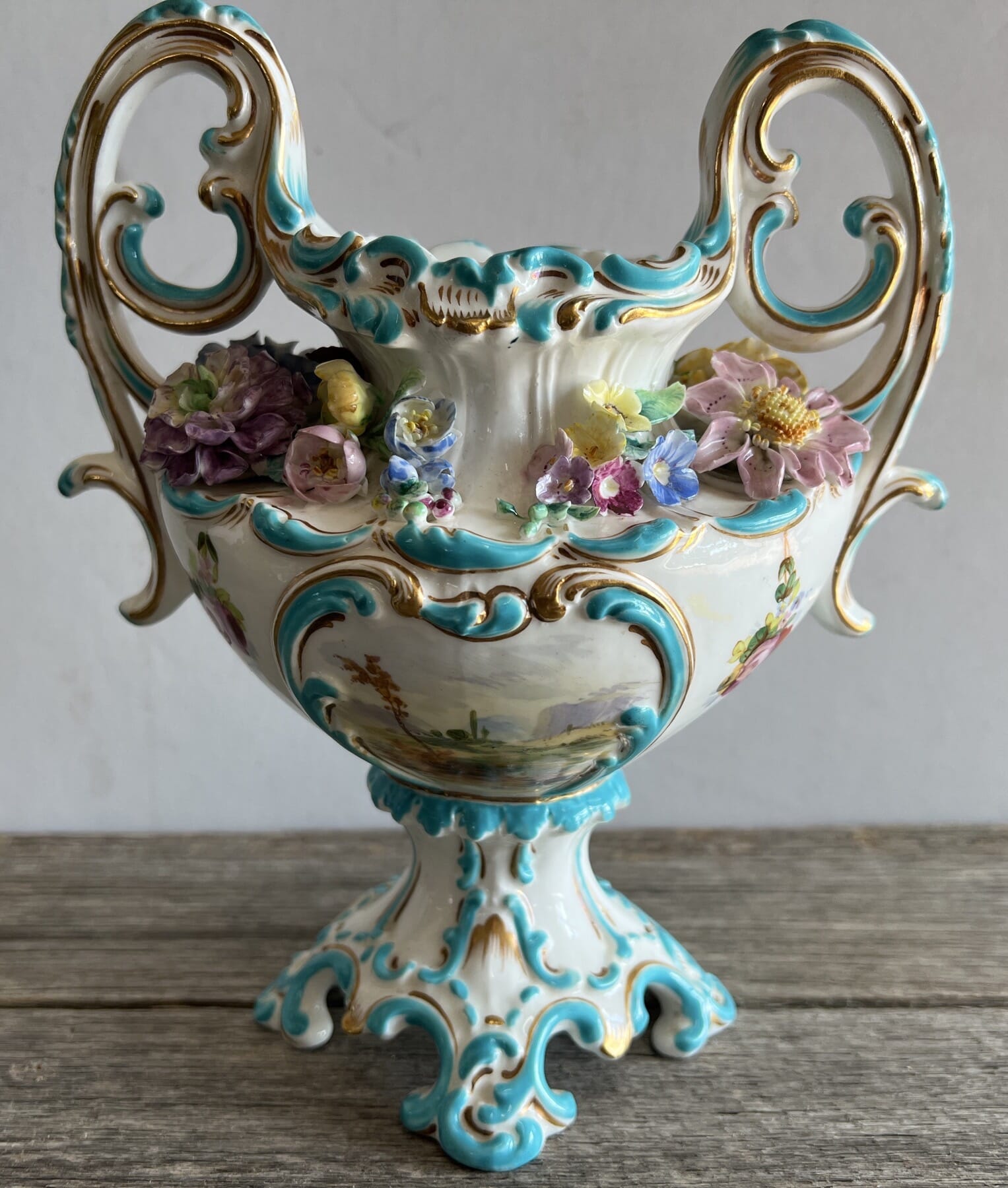 Coalport – Coalbrookdale – flower-encrusted double handled vase with landscape panels, c. 1840