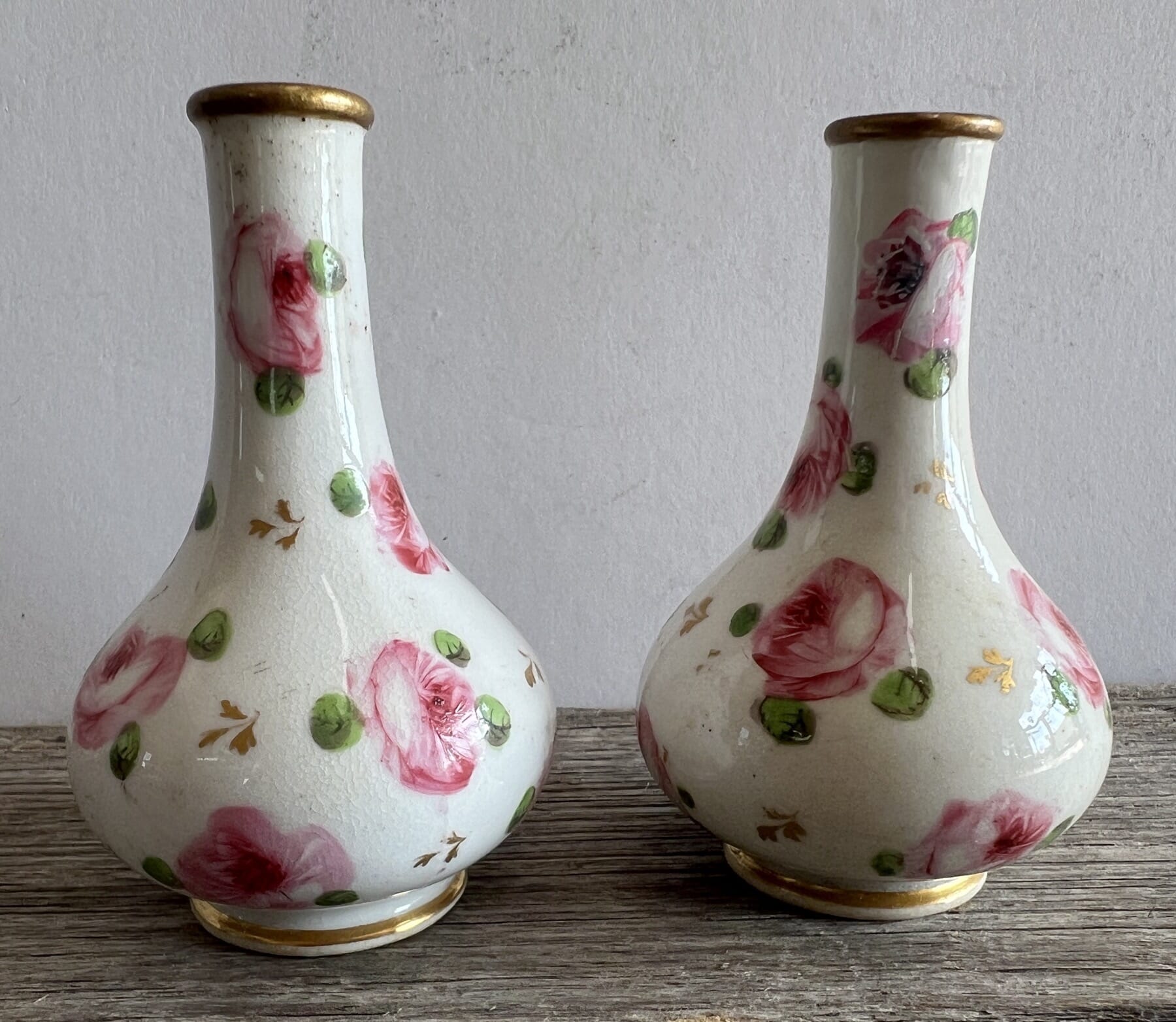 Pair of Derby bottle-shape vases, rose head decorated, c.1825