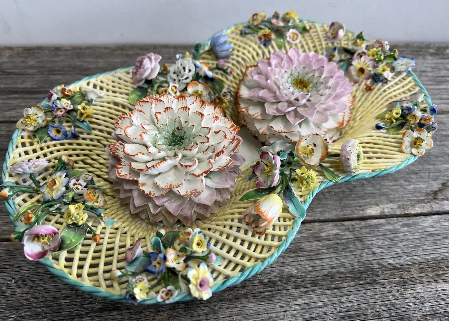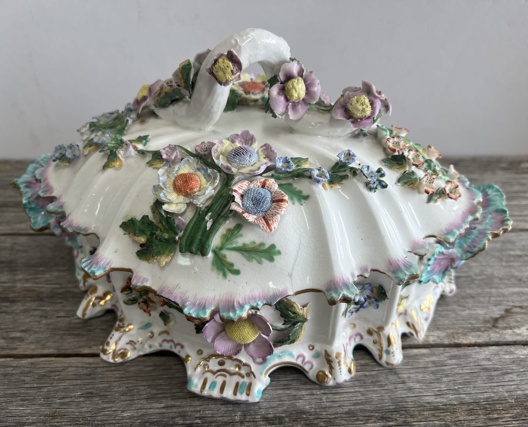 Coalport flower encrusted ‘shell shape’ basket with ribbon handle, c. 1835